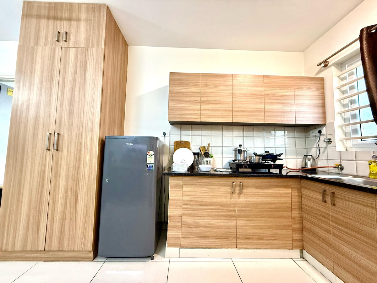 Te damos la bienvenida a nuestro luminoso, limpio y cuidadosamente diseñado departamento de 2 habitaciones y cocina cerca de JP Nagar. Tanto si vienes para una escapada corta como si te quedas más tiempo para trabajar desde casa, te invitamos a relajarte en el balcón, disfrutar de wifi rápido y sentirte como en tu propia casa. Ideal para viajeros de negocios, parejas y familias, nuestro espacio ofrece un entorno cómodo y propicio para el trabajo en un ambiente tranquilo y seguro, con fácil acceso a parques tecnológicos, restaurantes, cafeterías, hospitales y los principales centros de interés.