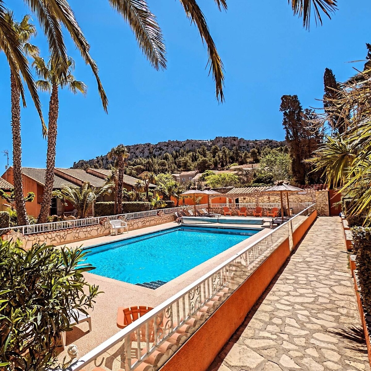 En un entorno tropical con piscina y solárium, a diez minutos de las últimas playas salvajes del Mediterráneo . Nuestras casas de campo con 2 dormitorios de 41 m2 (4 personas) tienen en la planta baja una gran habitación principal con un sofá cama, una cocina abierta, un inodoro, un baño con ducha y lavabo. Arriba un dormitorio con una cama doble, un pequeño dormitorio con 2 camas que están literas en un patio trasero privado, así como una terraza delantera donde puedes relajarte a la sombra de las palmeras.