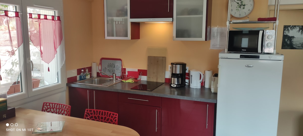 Alojamiento de 27 m2, en la planta baja. Sala de estar con 1 sofá cama de 160 x 200 cm y 1 dormitorio con aire acondicionado, con una cama de 160 x 200 cm. Cuarto de baño, ducha italiana, inodoro. Barbacoa en un jardín terraza, todo reservado exclusivamente para los viajeros. Se proporciona la ropa de cama: sábanas, fundas de almohada y edredones. Toallas, paños de cocina Gel de ducha . Y para la cocina: Sal, pimienta, azúcar, té. Cafetera de filtro + cafetera Tassimo. 2 cafeteras.