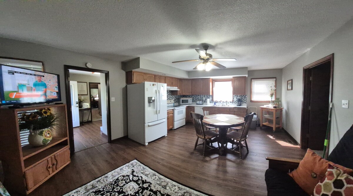 Disfruta de las vistas de Manhattan desde nuestra tranquila suite en el sótano de dos dormitorios/1 baño en la cima de una colina con entrada privada, tu propio termostato, wifi gratuito, baño completo con bañera/ducha y una habitación con mininevera, microondas y TV. Aparcamiento en el lugar con escalones de piedra que conducen a una entrada privada en el patio trasero con una chimenea para relajarse bajo las estrellas. Fácil acceso al campus de KSU, al estadio, a Aggieville y a Ft. Riley. Los huéspedes acceden al espacio independiente con llegada autónoma. Ten en cuenta que los propietarios viven arriba.