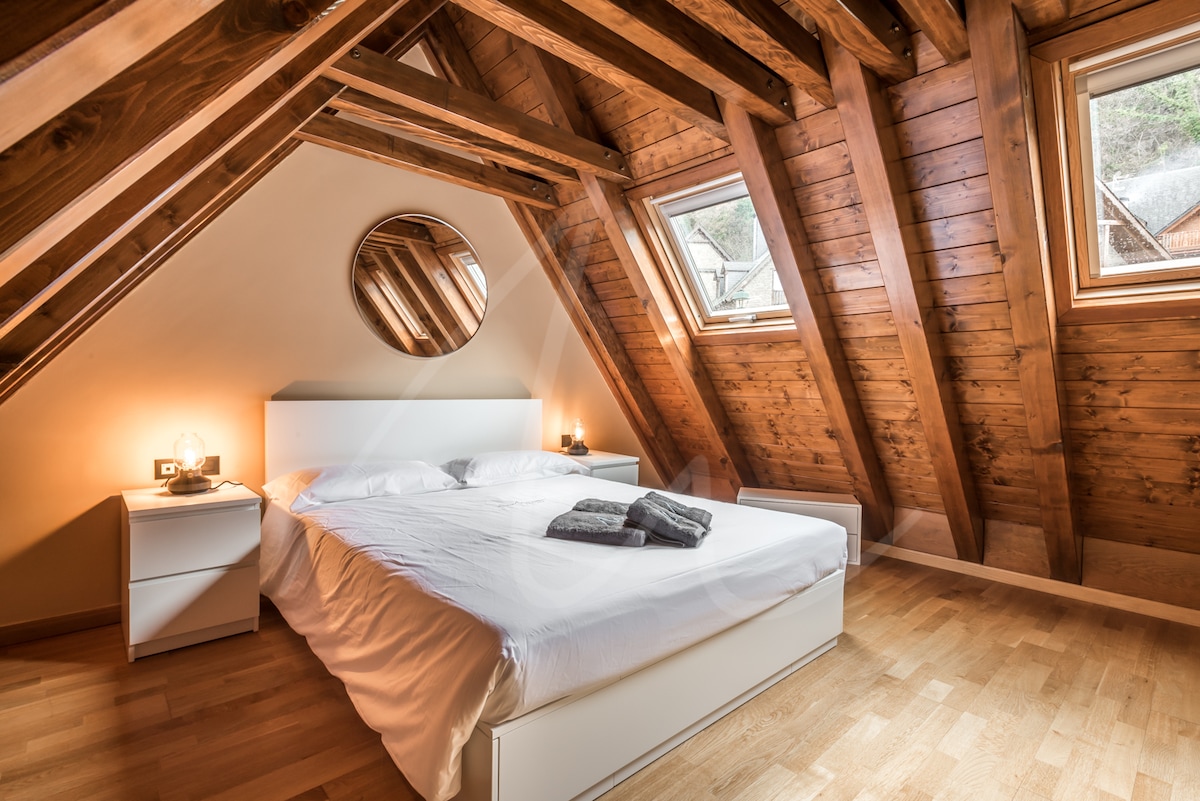 Luminoso dúplex abuhardillado en el centro de Vielha. Con plaza de PARKING y PISCINA en Julio y Agosto. Con orientación sur y unas vistas despejadas a la montaña. Cálidos acabados de madera. Espacio preparado para un máximo de 4 personas (cama doble + sofá cama doble) ideal para parejas, familias o pequeños grupos que quieran disfrutar de la montaña, el senderismo, las pistas de esquí o la gastronomía del Valle. No olvides que tu mascota es bienvenida como uno más de la familia.