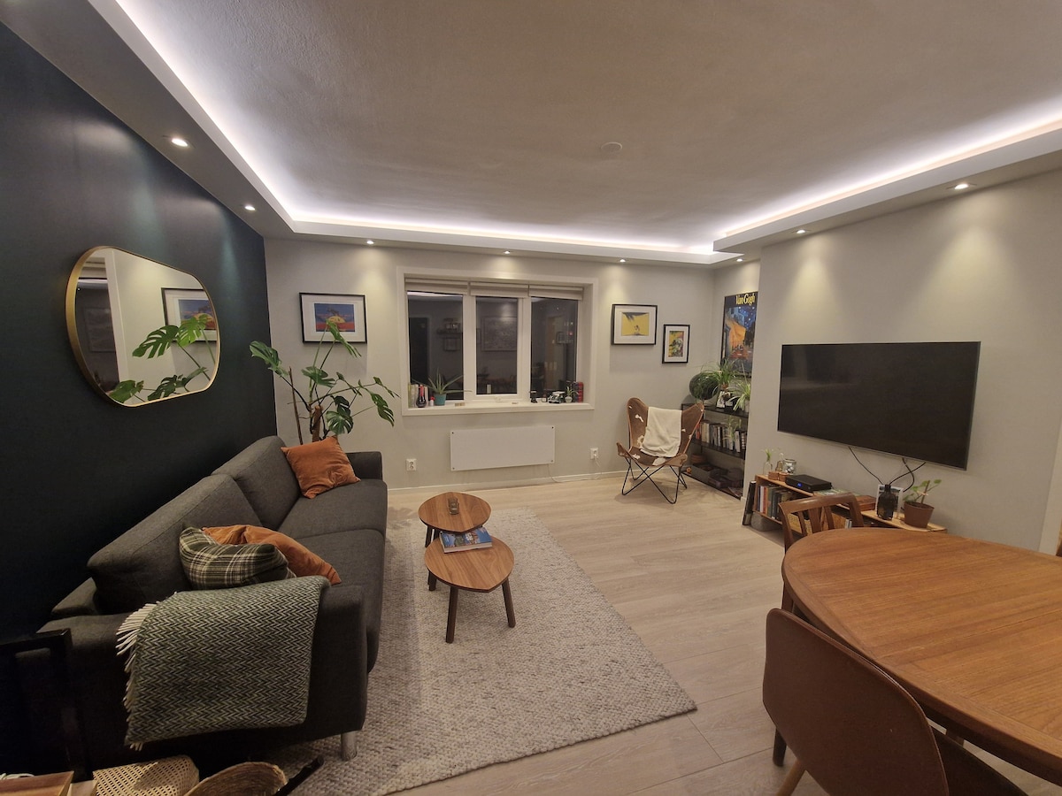 Bright and modern 2-bedroom apartment with a high standard and fine qualities, own free parking right outside the apartment. Here you live in a central location in attractive surroundings with walking distance to "everything" you need in everyday life. With, among other things, immediate proximity to light rail stops, shops and great walking areas/green areas. Well equipped kitchen. There is a washing machine with a dry function.