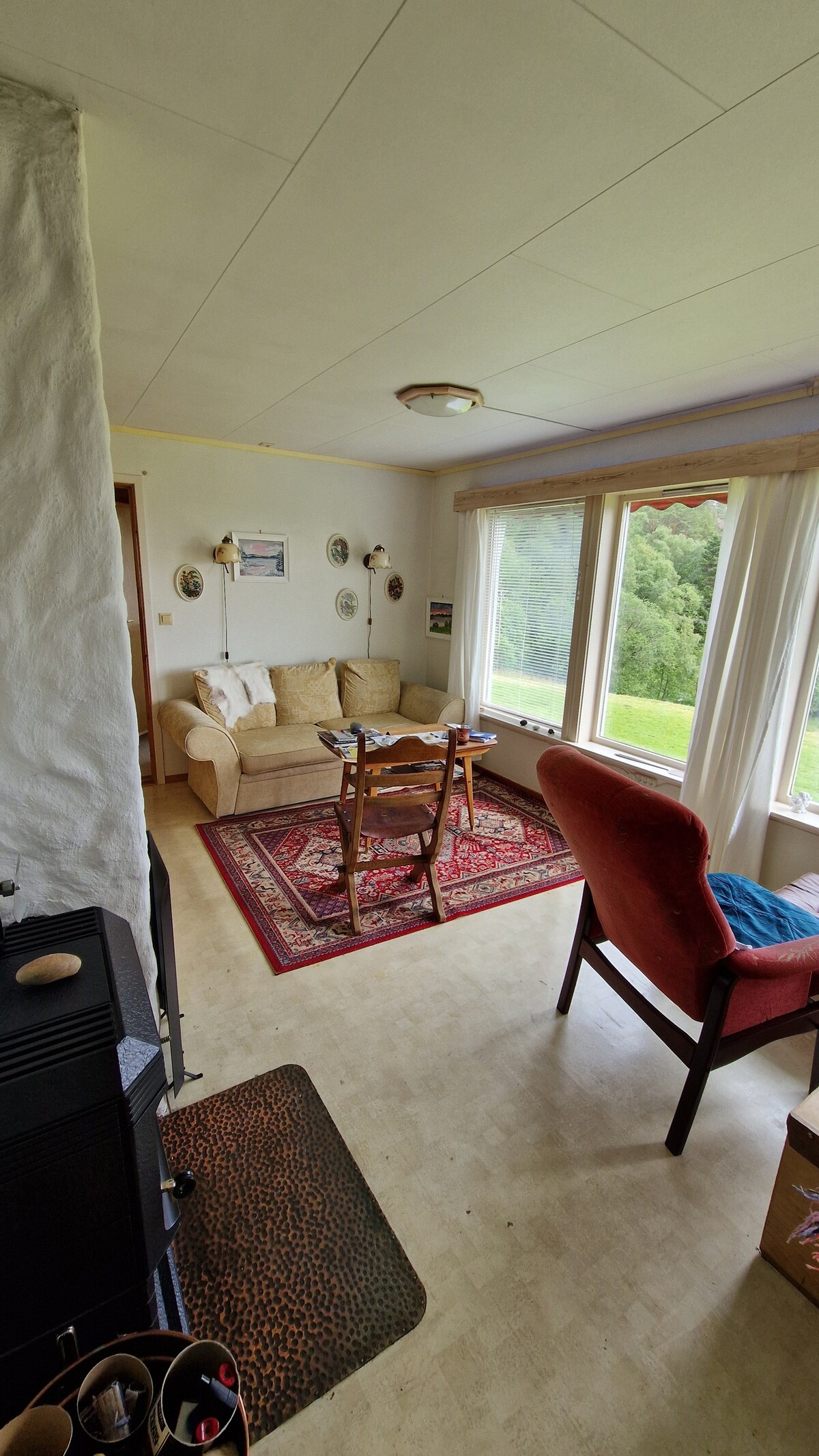 Relájate con toda la familia en este lugar tranquilo para hospedarte. Tienes la cabaña principal con dos dormitorios, cocina y baño. Cabaña con 1 cama doble y 2 camas individuales. Además, una gran sala de estar al aire libre con un estilo antiguo de 25m'2. Tienda de comestibles, combustible y centro en Dale a unos 25 minutos, tienda de conveniencia a 5 minutos de la cabaña. También hay excelentes oportunidades de senderismo en la zona Puedes usar la lancha motora de forma gratuita, llenas el combustible tú mismo si está vacío.