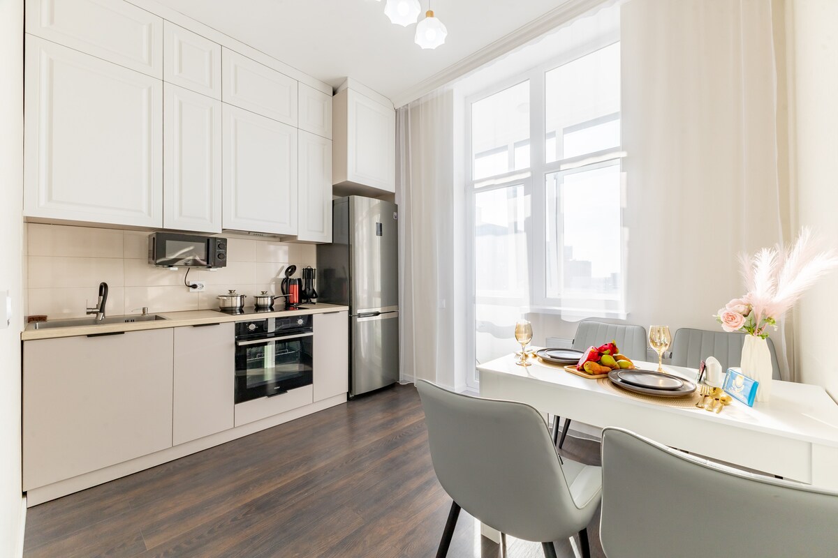 Departamento nuevo cerca de los complejos deportivos Barys Arena, Astana Arena, Kazajstán, Velotrek Sary Arka. También hay un jardín botánico, un centro comercial, un restaurante y un gimnasio, un supermercado cercano. Disfruta de una experiencia elegante en el corazón de la ciudad. Estoy seguro de que disfrutarás de tu estancia con nosotros, ya que nuestros huéspedes dejan excelentes reseñas. Estaremos encantados de recibir huéspedes y siempre esperamos hacerlo.