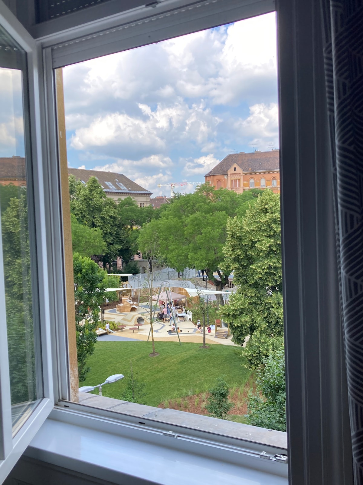 The view is of our renewed beautiful green park! The apartment is suitable for 6 people. The 81sqm apartment has well equipped kitchen. The kitchen has cutlery and plate sets, fridge, microwave, coffe machine, toaster, electric kettle. The apartment also has a washing machine, sauna, air condition furthermore provides shampoo and shower gel, hairdryer and 2 different size of towels per person. The building is over 120 years old, its period atmosphere is unmatched!
