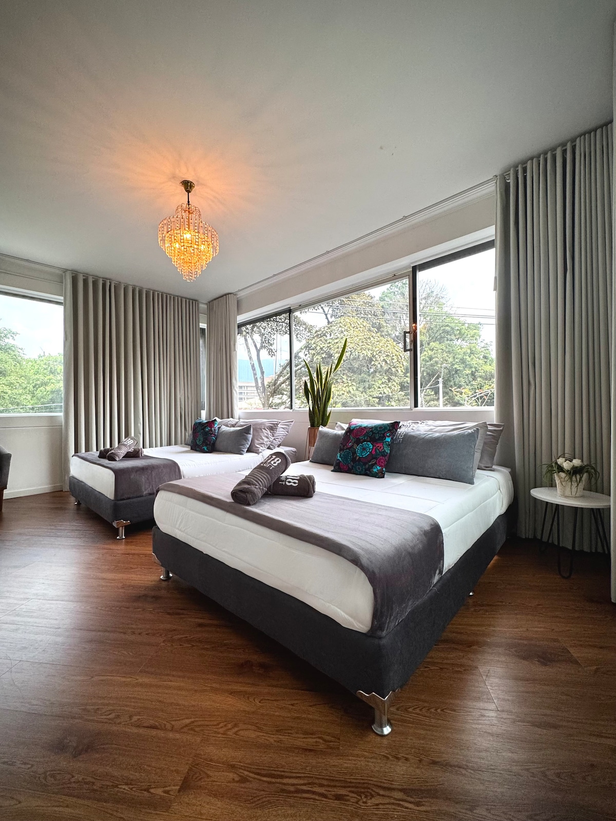 Con un amplio espacio de 23m2, cuenta con una acogedora alcoba, una zona de entretenimento perfecta para relajarte, un balcón para disfrutar de una espléndida vista, cocina equipada, un cómodo escritorio para trabajar; amplio vestier para organizar tus pertenencias, lencería de calidad y un baño completo para tu comodidad. Cuenta con cajilla de seguridad, plancha y mesa para planchado.