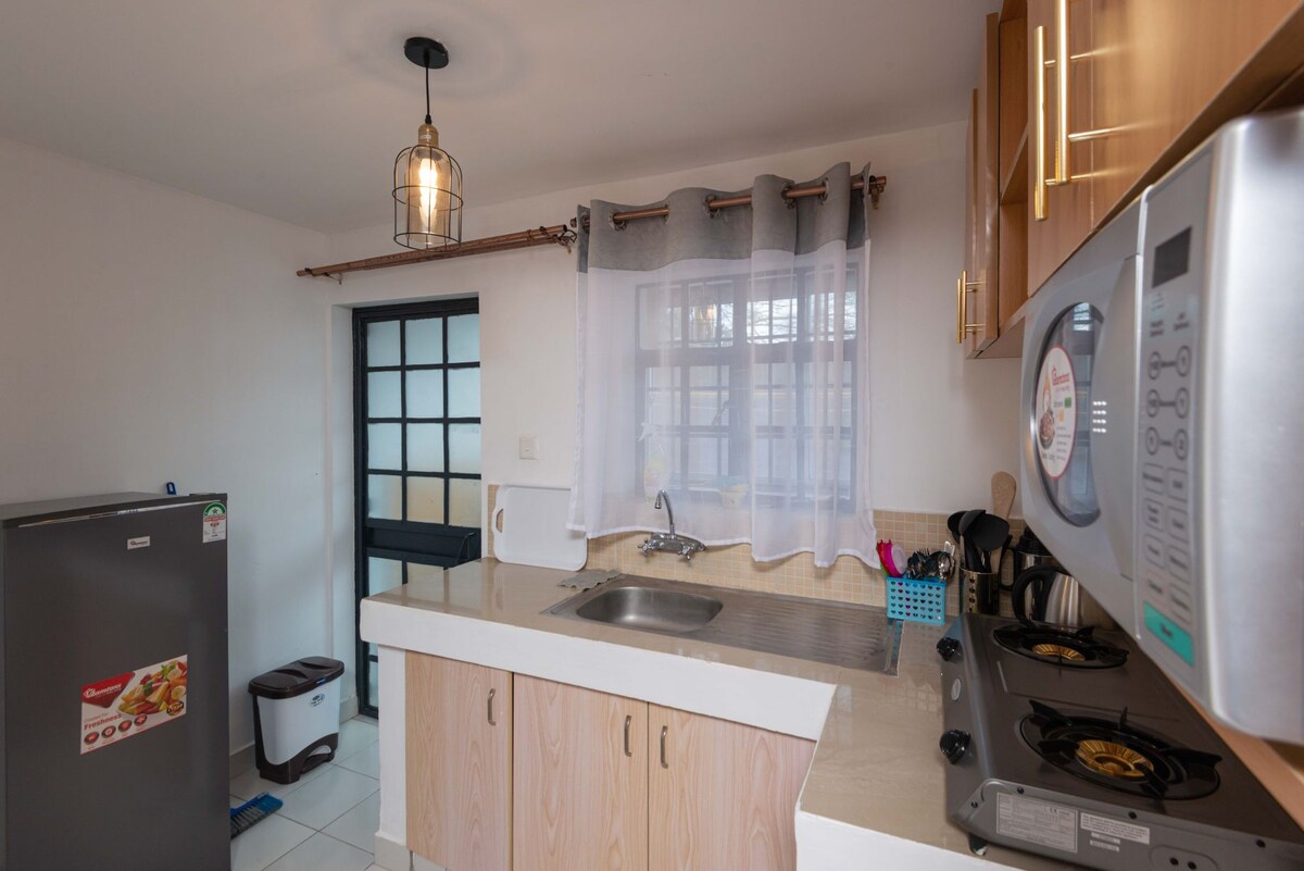 Karibu a tu acogedor apartamento tipo estudio de diseño abierto y luminoso, perfecto para escalas o estancias largas. A solo 8,7 km de JKIA, a 3,9 km de SGR, a 3,3 km de la autopista que conecta con Westlands a 19 km (se aplican cargos de peaje) y a 1,8 km del centro comercial Gateway. Es seguro hacer el check-in incluso tarde en la noche con seguridad 24/7, ascensor y acceso con teclado. Cuenta con conexión Wi-Fi rápida, generador de respaldo, cama tamaño queen, espacio de trabajo, cocina moderna, gimnasio gratuito y acceso a la piscina y servicio de limpieza de cortesía. Disfruta de nuestro café y té keniano.