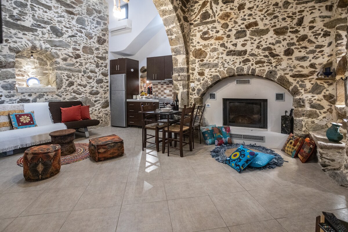 The KORES boutique houses are an independent, self-catering lodging of two furnished residences that have been specially developed in a completely renovated multi-storey medieval building, in the traditional district of Topanas, on the western side of the old Venetian harbor of Chania.Both residences are enchanting houses with hospitable rooms in light and frugal lines. The harmony of spaces in levels, the arches, erratic walls, the galleries and Venetian walls that constitute a part of the house, create an astonishing cluster of medieval architecture in the two residences with the names "Aspasia" and "Ekaterini". "Aspasia" occupies the ground floor and the first floor of the lodging and consists of: The ground floor with a double bedded bedroom and another with a couch – bed, and a bathroom with open shower. The first floor with the living room, the dining room and open-plan kitchen, two bathrooms with closed showers, a master bedroom in the loft and a bedroom with two single beds below. "Ekaterini" occupies the second and third floor of the lodging and consists of: The second floor with the living room, dining room and open plan kitchen, a bedroom with two single beds, a den with the “Turkish” couch that can easily host a 5th individual in the residence if necessary and a bathroom with a closed shower. The rooms of the second floor have access to a garden with a dining table, six chairs and an umbrella offering ample shade. The third floor with a master bedroom and its private terrace with a couch, a patio table and sun beds give the opportunity to guests to enjoy relaxation in the sun and the unhindered views of traditional backstreets, roofs and lofts of buildings, and of the mountains in the south.