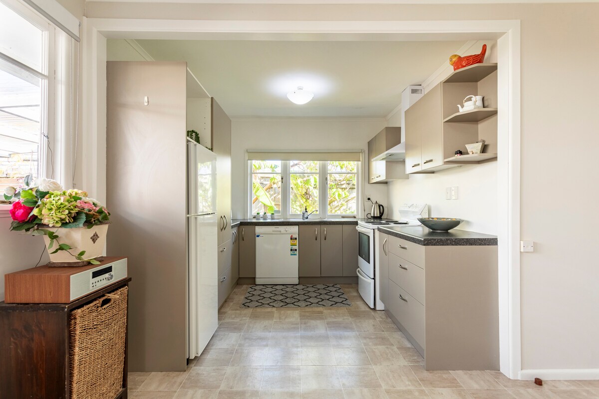Bungalow de los años 50 en el pueblo. Clásico y acogedor. Maravillosos espacios al aire libre para sentarse y charlar con amigos, ¡realmente únicos! A 2 minutos a pie de cafeterías, bares, comida para llevar y otras tiendas pequeñas interesantes. Cerca de la parada de autobús que te llevará a la ciudad o, si lo prefieres, a pocos pasos del ferry para un viaje al popular Hobsonville para visitar los emocionantes cafés, bares y el mercado de agricultores o directamente a la ciudad. Ofrezco privacidad a los huéspedes, pero solo estoy a una llamada o a un mensaje de distancia. ¡Ubicación muy práctica!