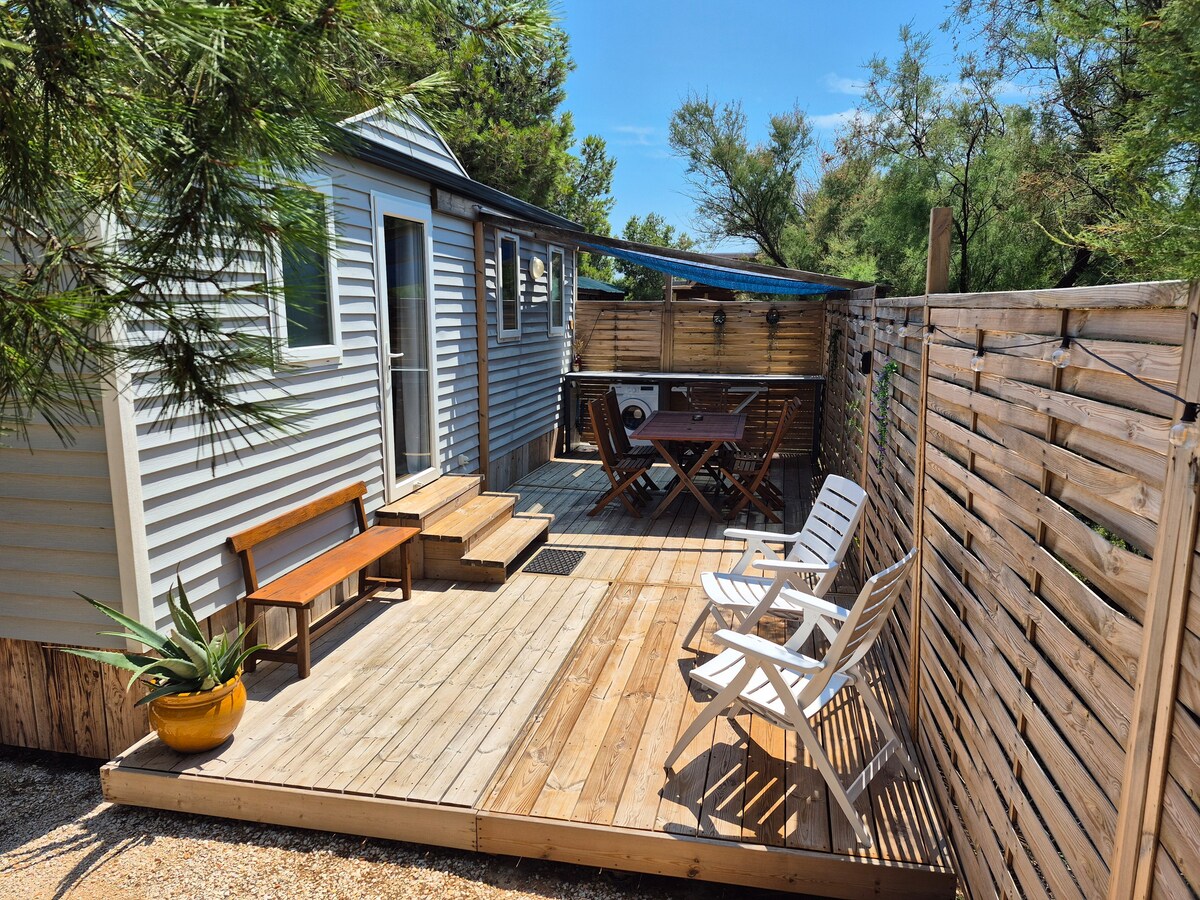 MOBIL-HOME de 6 plazas y 40 m² con aire acondicionado reversible, gran terraza exterior vallada con 1 puerta de seguridad, muebles de jardín y 2 tumbonas. Amplio salón con TV orientable, 1 sofá cama de 2 plazas, 2 habitaciones grandes, 1 de ellas principal, ropa de cama de alta gama con un gran vestidor y TV Cocina equipada, vajilla, horno, microondas, placa eléctrica, nevera con congelador, tostadora, hervidor, cafetera de filtro y cápsulas TASSIMO, lavavajillas, lavadora y tendedero.