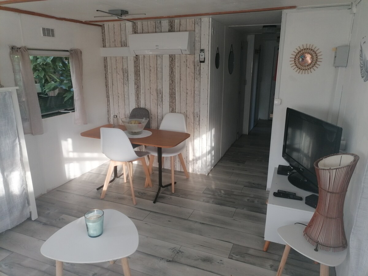 Alquiler casa móvil totalmente reformada, en un camping familiar tranquilo en una ubicación de 110 m2. Capacidad para 6 personas: 1 habitación grande con cama de 140, 1 pequeña habitación con cama 140, y un sofá cama en la sala de estar. Totalmente equipado:aire acondicionado reversible, televisión, refrigerador congelador, plancha de gas, microondas, horno, senseo. A 80 m de la playa vigilada en verano. Estacionamiento entrada camping. Techo a 2 m y puertas estrechas. Zona de juegos para niños, bolera, sanitarios. No hay animación ni piscina.