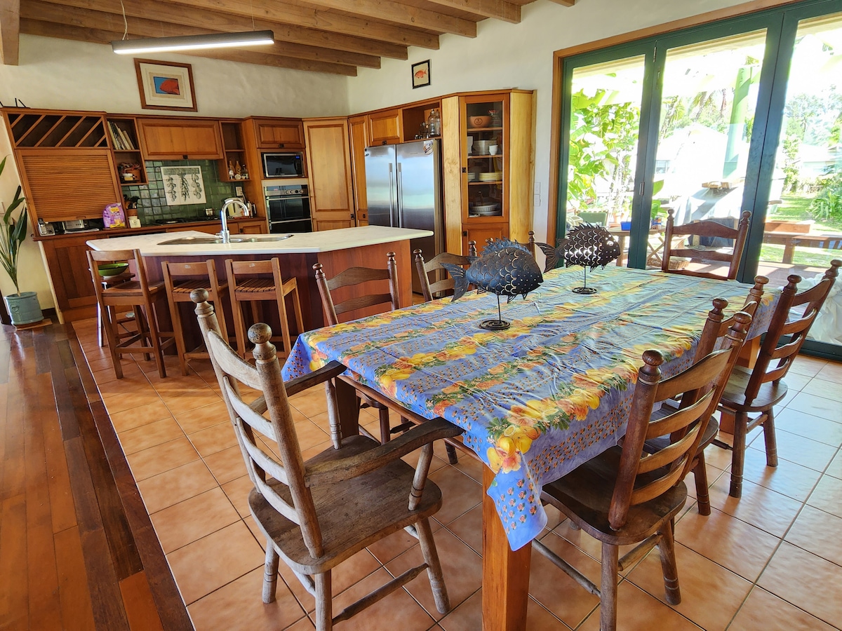 This tropical oasis awaits you. Enjoy the privacy and luxury of Polynesian living . Soak up the sun and unwind by the pool. Relax on the deck and take in the panoramic views of the Pacific Ocean. Enjoy evening barbecues on the deck or by the pool or retreat to your own indoor living space. Nestled within a lush tropical garden this property has everything you need to make your stay a memorable one. Nearest swimming beach 5 mins away. Wheelchair access throughout.