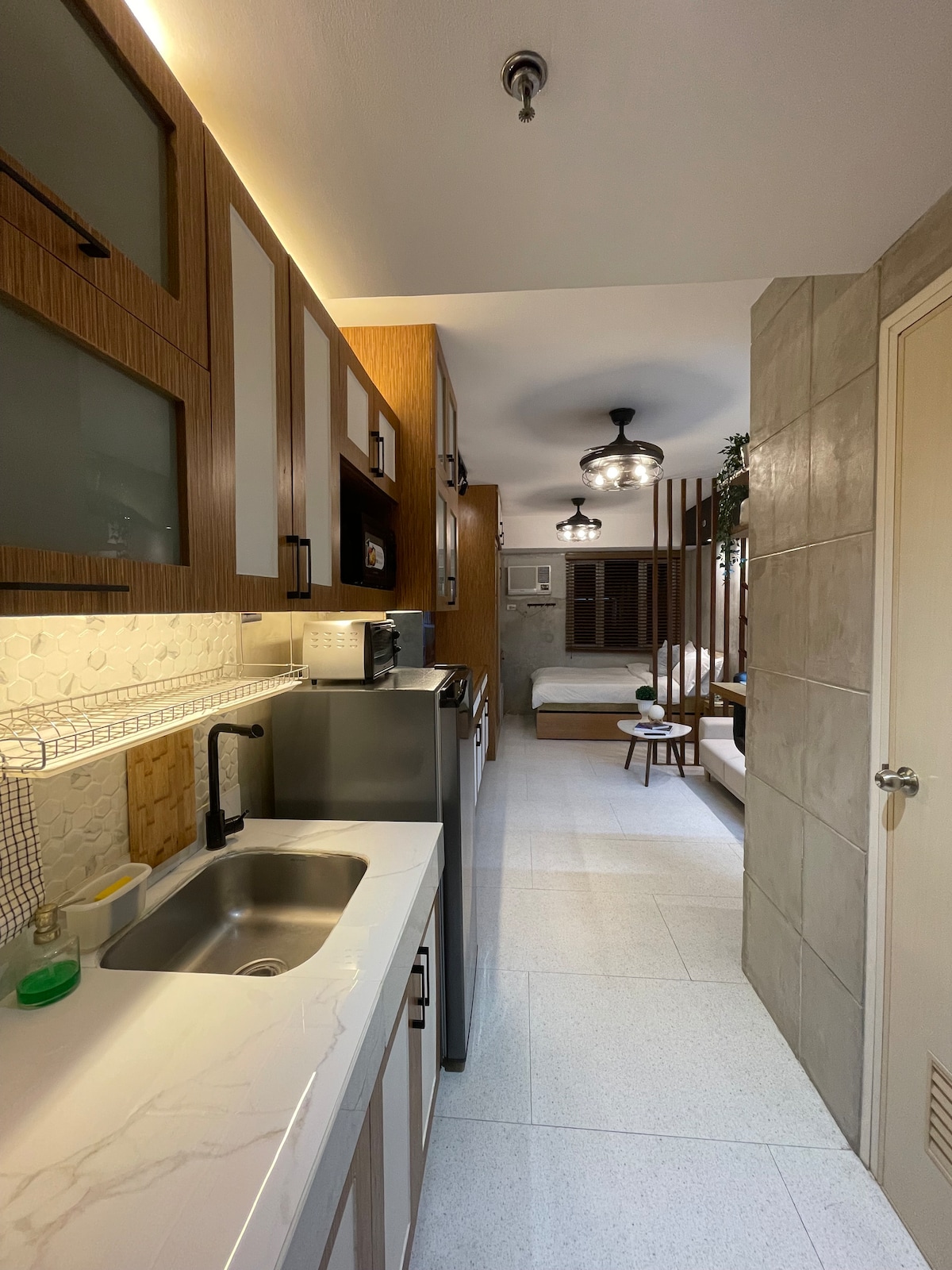 Moderna unidad de inspiración tropical en M Place @ South Triangle Tower D, Panay Ave., Ciudad Quezón. Disfruta de Internet de alta velocidad, TV inteligente con Netflix, una cocina pequeña (sin cocina) y una acogedora estación de trabajo. Ubicado en un vibrante centro comercial con supermercados, bancos, restaurantes, lavanderías y cafés en la planta baja, perfecto para una estancia relajante pero cómoda en el corazón de la ciudad.