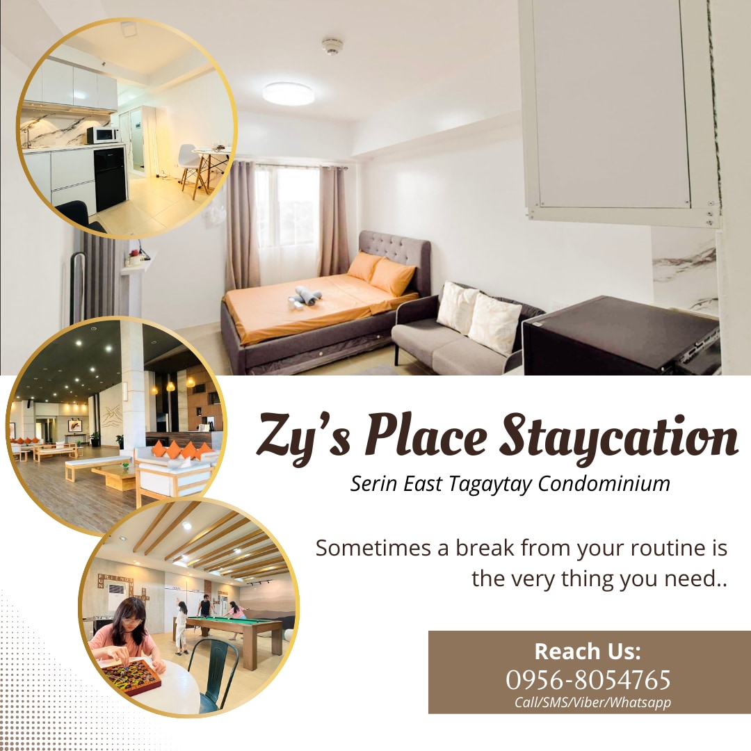 ❤️Nueva unidad, sábanas frescas y muebles nuevos. Disfruta de las dos vistas de Silang y del lago Taal desde el piso más alto (piso 23). ✅Experimenta un ambiente acogedor con toques elegantes, que te invita a relajarte con comodidad y estilo. 🔴 A poca distancia a pie de Skyranch, junto a Robinsons Tagaytay y Primark Mall, Starbucks, McDonalds, mercado de caoba, restaurantes y muy cerca de todos los lugares turísticos de Tagaytay. ✅👌🏻Muy accesible al transporte público❗️. Estamos ubicados a lo largo de la autopista, ideal para viajeros.