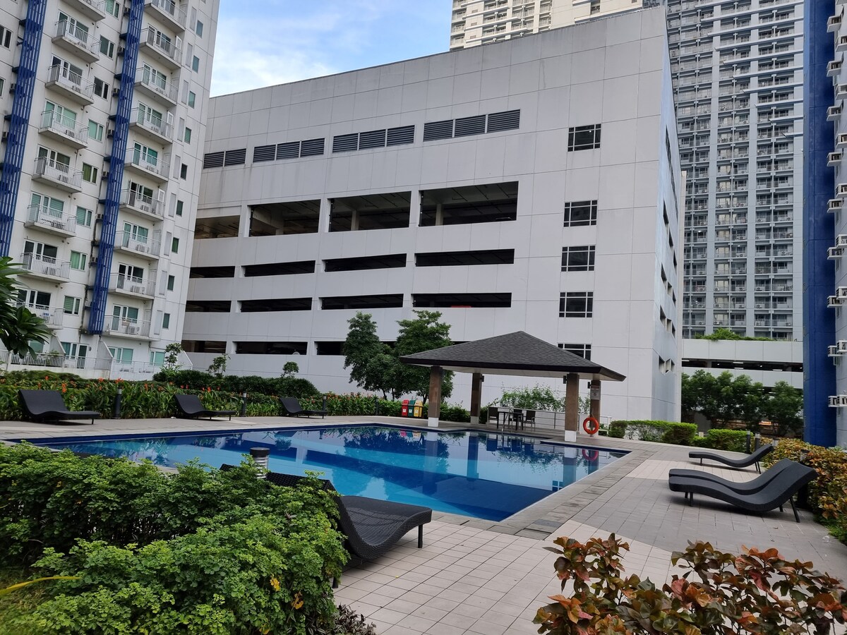 Vista a la piscina 2BR cerca de BGC y RMC | Capacidad para 6 personas