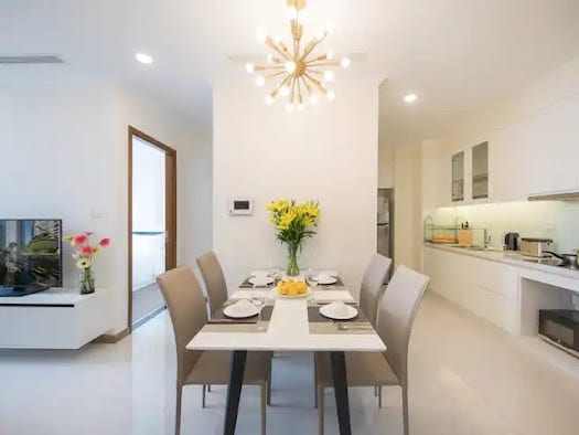 Căn hộ 1pn nằm trong tòa Landmark 81 có đầy đủ nội thất sang xịn: máy sấy tóc, bàn ủi, máy giặt, vật dụng bếp chén bát, bếp điện,... - 1 bedroom apartment located in Landmark 81 building with full luxury furniture: hair dryer, iron, washing machine, kitchen utensils, electric stove,...