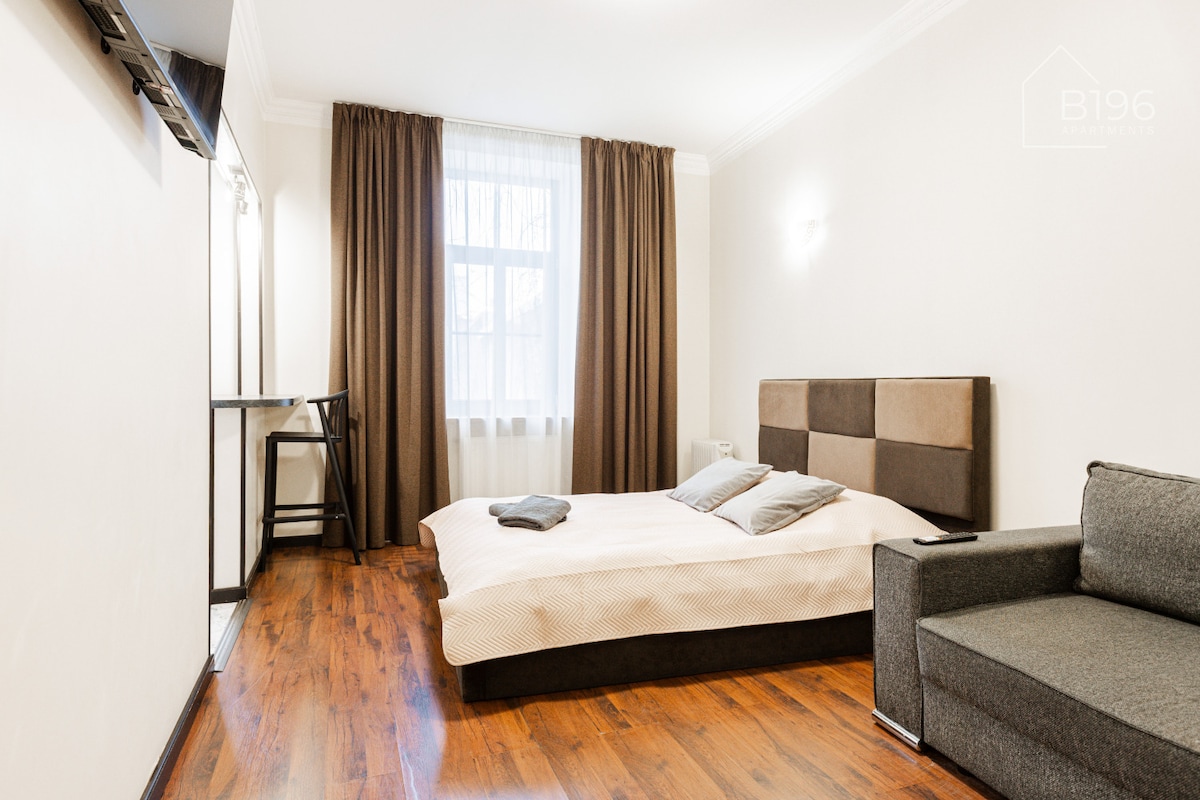 A cozy small apartment in the center of the Old City, located on the 2nd floor of a historic renovated building .2 windows with blackout curtains overlook a quiet courtyard. Everything you need for a comfortable stay for 2 people: self-arrival 24 hours a day, fast WI-FI and digital TV, a kitchen with all necessary equipment , a sleeping area with a folding sofa bed , a bathroom with a rain shower, hairdryer, other useful things. We are especially careful about cleanliness of the apartment.