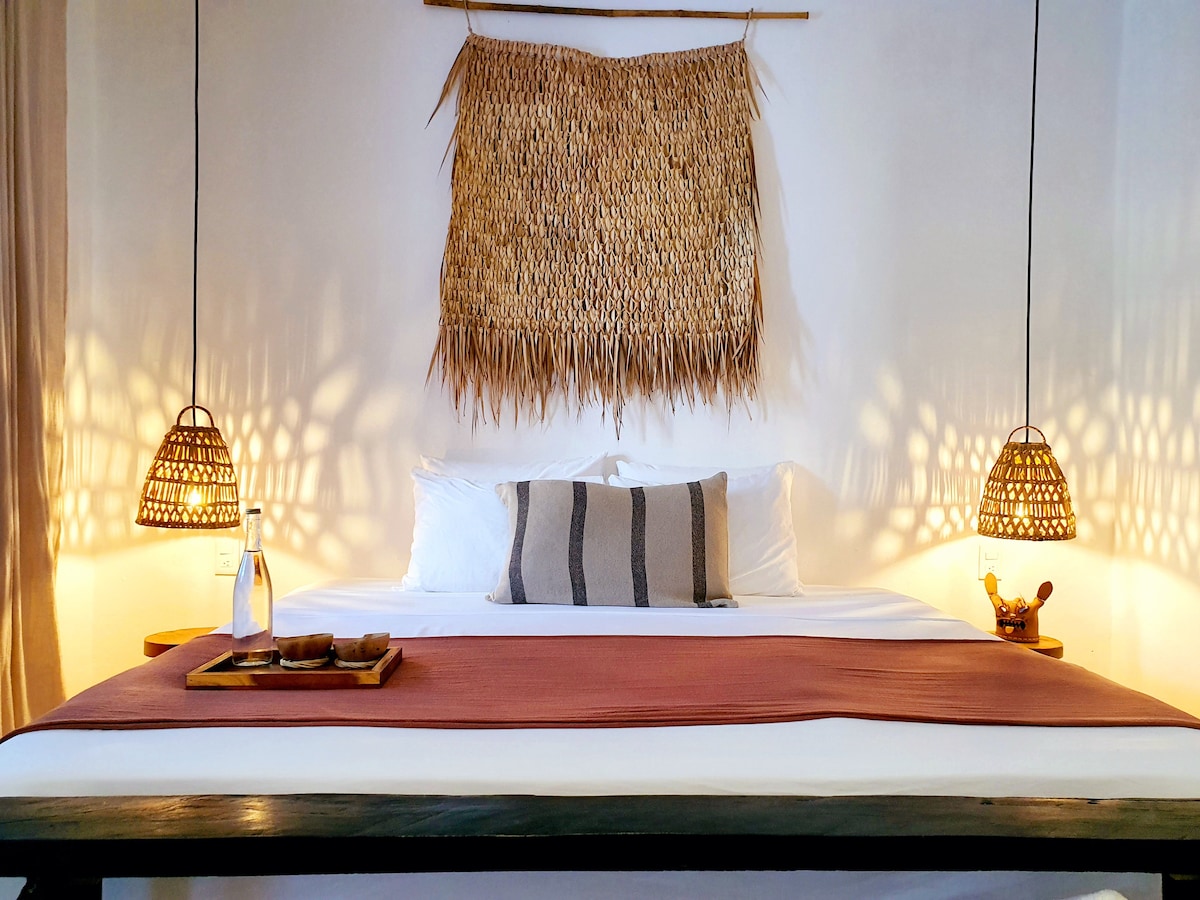 Immerse yourself in a unique experience in our Colibrí cabin, a cozy suite nestled in the heart of the Bacalar jungle. Decorated with exclusive artwork and custom design details, this cabin invites you to disconnect and enjoy nature in a serene and creative environment. Every corner of the cabin radiates tranquility and art, offering an unforgettable stay at the Lagoon of Seven Colors.