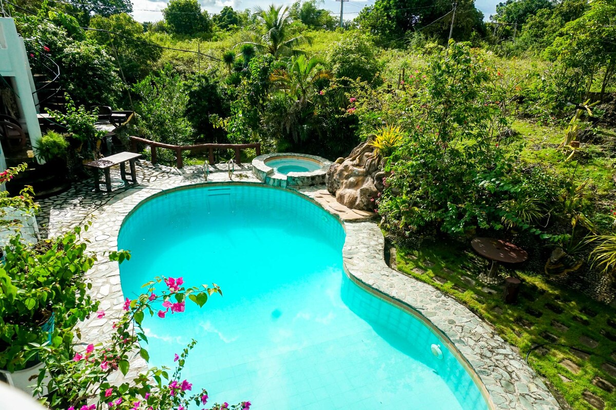 Venga a disfrutar de nuestro espacioso Bungalow cerca del mar en el acantilado con vistas a las hermosas aguas del estrecho de Bohol. Nuestro bungalow para huéspedes ofrece un dormitorio grande con aire acondicionado y alojamiento para 2 huéspedes. Disfruta de tu café de la mañana en el patio. Sumérgete en nuestra piscina cristalina y sin cloro para un descanso refrescante. Camina por los escalones del acantilado para saltar al océano para practicar esnórquel increíble, el increíble arrecife lleno de peces tropicales y coral, justo enfrente de la propiedad. ¡Disfruta!