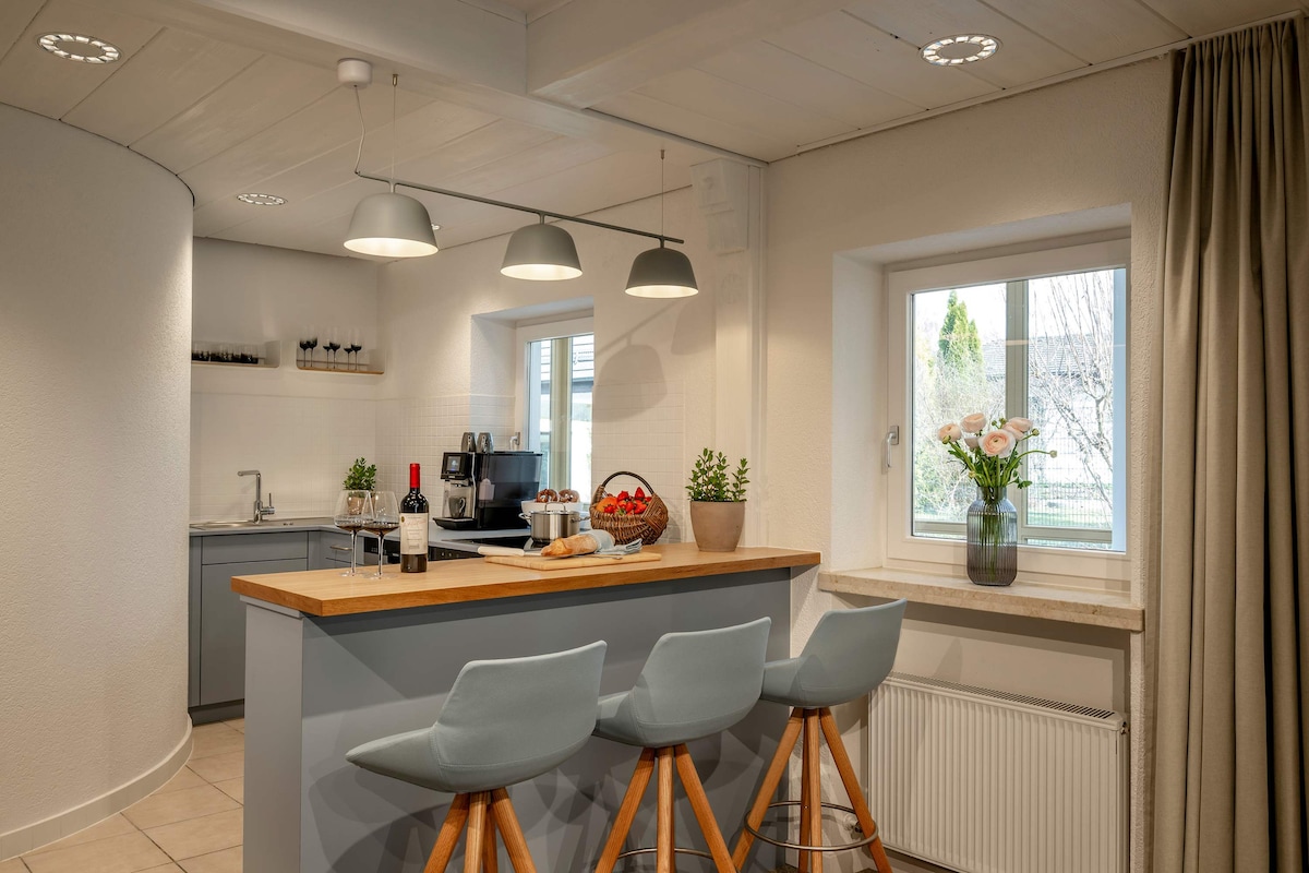 Wir bieten ein ganz besonderes Holz-Haus mit Fass-Sauna direkt am Tor zum Allgäu. Zentral gelegen, um zahlreiche Ausflüge zu unternehmen oder einfach ein paar schöne Tage in einem nachhaltig gebauten und eingerichteten Haus zu verbringen. Hier bleiben keine Wünsche offen! Top ausgestattete Bulthaup Küche, großer massiver Eichenholztisch im Zentrum. Auf der Terrasse wartet ein Holzkohle-Grill darauf, befeuert zu werden und im großen Garten lassen Trampolin, Feuerstelle die Herzen höher schlagen.