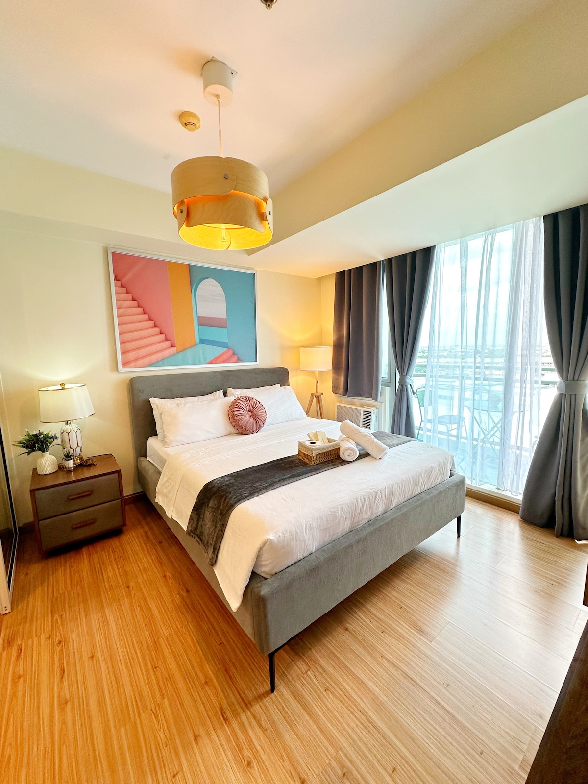 Un apartamento de 34 metros cuadrados, totalmente amueblado, digno de Instagram, acogedor y elegante, con 2 dormitorios y un impresionante balcón donde podrás relajarte, celebrar eventos importantes o simplemente tener una escapada rápida con tu familia o amigos y disfrutar de servicios únicos de clase mundial como la piscina de olas, la playa blanca artificial, el parque infantil, la cancha de baloncesto, el gimnasio, la cancha de voleibol, el bar de playa, el jardín elevado y muchos más. Se encuentra a solo 5 minutos a pie de un centro comercial (SM Bicutan) y a solo 10-15 minutos del aeropuerto NAIA.