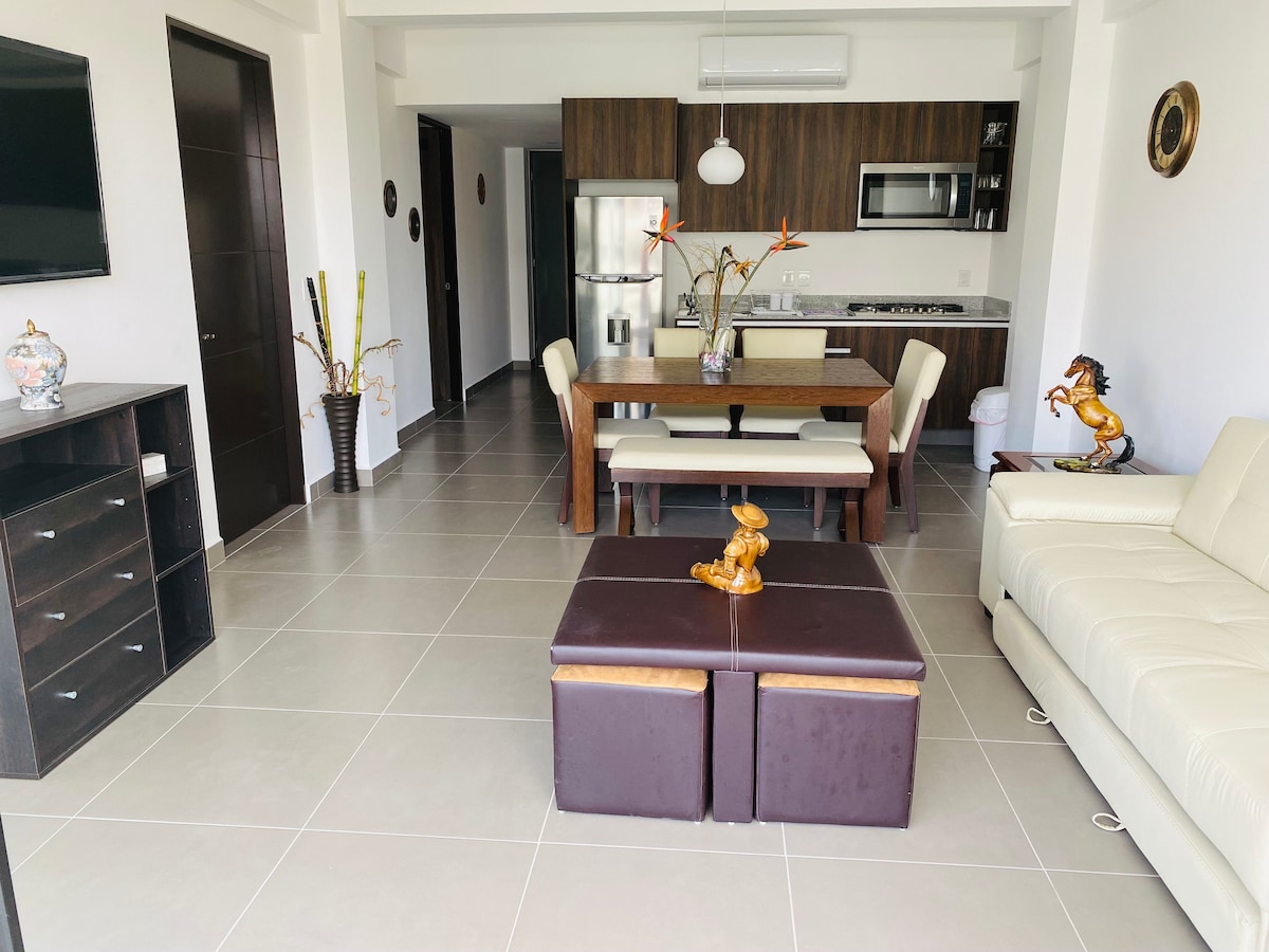 Nuevo Departamento para 4 a 6 personas. TOTALMENTE equipado. Muy tranquilo y exclusivo. Cocina con lavatrastes Tv y teatro en casa. AMENIDADES: infinity pool climatizada, Roof top con alberca, restaurante, camastros, area pingpong, Gym, Sauna y Vapor para tu relajación. 5 min a centro bucerias y 15 de marina de Nuevo Vallarta.