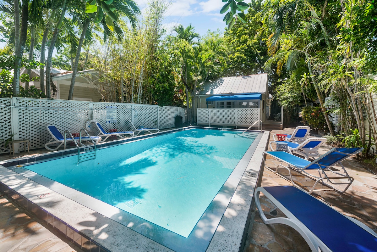 Alquiler con estadía mínima de 28 noches. Situado en un barrio a 3 cuadras de Duval y a pocos pasos o en bicicleta de Higgs Beach, Southernmost, panaderías, galerías y cafeterías cubanas. La casa de campo tiene un patio vallado, piscina y dos porches cubiertos con vistas a los jardines delantero y trasero. Nuestro alojamiento se encuentra en la planta baja de la casa. Nuestro inquilino a tiempo completo vive en un estudio independiente, al que se accede por una entrada lateral y unas escaleras en la parte trasera de la propiedad. Los huéspedes en Airbnb tienen uso exclusivo de los porches, la piscina y la terraza.