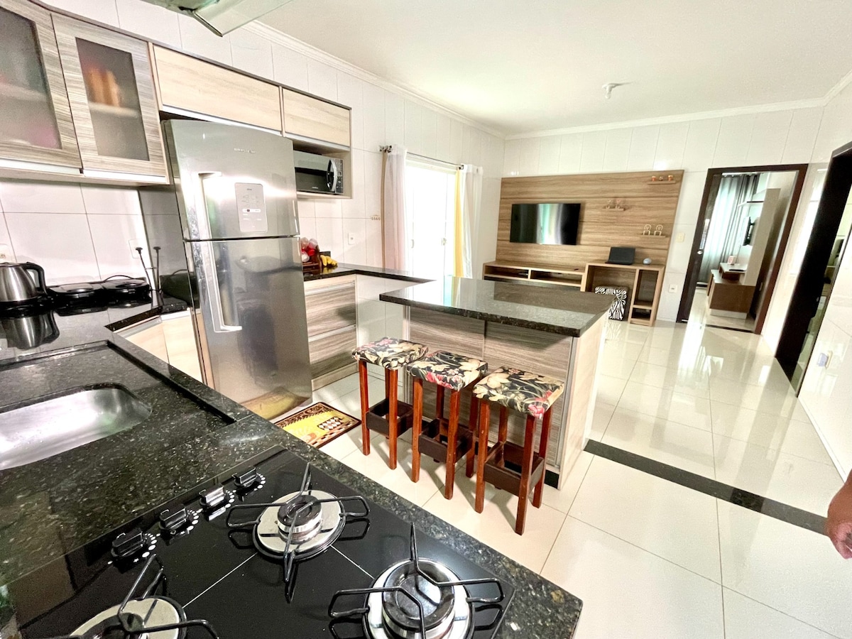 Casa cómoda y acogedora en el corazón de Itapoá; a 3 minutos a pie de la playa Second Pedra. Estamos cerca de supermercados, farmacia, tiendas pequeñas, restaurantes y bares de aperitivos; pero la casa también está equipada para chefs y cocineros; desde barbacoa hasta paellera. ¡Se pueden alojar tranquilamente a 8 personas! El garaje tiene capacidad para 3 coches. ¡Y todavía hay un gran patio trasero para disfrutar! Es un delicioso jacuzzi para relajarse. ¡Es el alojamiento perfecto para tus vacaciones! <3