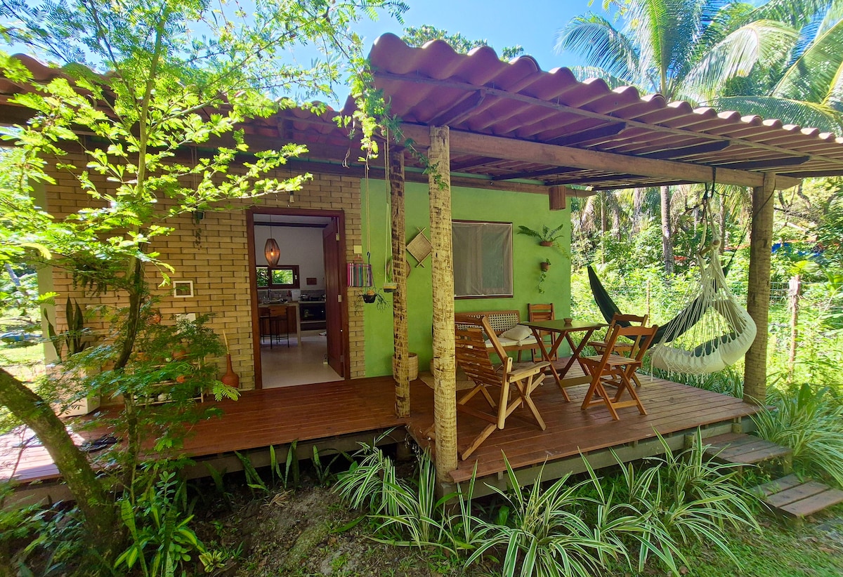 Refúgio na Floresta da ilha de Boipeba. À 800m-Piscinas Naturais do Moreré, 200m-Vila Quilombola Monte Alegre e 3km-Vila de Boipeba. Com a casa feita de barro somos parte da Natureza. O intuito aqui é ser harmônico e se misturar ao espaço. Por isso a casa foi feita com material mais sustentável: madeira, garrafas, vidros e janelas de ônibus e carro. Sanitário seco por câmara compostável, e água que nasce ali e volta pelo círculo de bananeiras. Estar ali pra mim é sentir-se um só com a mãeTerra.