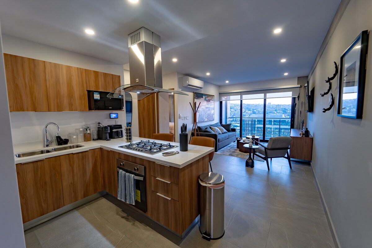 Departamento moderno y elegante en Torre premium y excelente zona Disfruta de un departamento de concepto abierto, diseñado para ofrecer confort y una experiencia superior. La cocina totalmente equipada se integra con el área social, creando un espacio amplio y luminoso, ideal para descansar o trabajar con comodidad El departamento cuenta con dos recámaras, ambas pensadas para el descanso absoluto, un baño completo y amplio TV smart e internet de alta velocidad, dándote la mejor experiencia