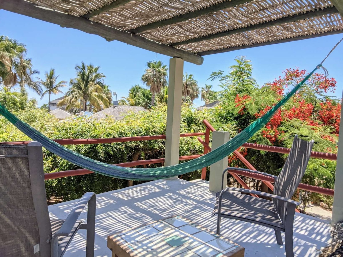Unbeatable views of mountains AND ocean (no exaggeration) at Casita de Luna, an oasis near the beach. King bed, Starlink lite Wifi, filtered kitchen water & no traffic! Only 3 min walk to beach & 10 min walk to restaurants, market, laundry & sea turtle releases. One neighbor close on north side but open desert & ocean view to south, yet 10 min drive to town with more restaurants & shopping. Surfing a few miles north & whale watching on the large front porch & rooftop! NO smoking on property.