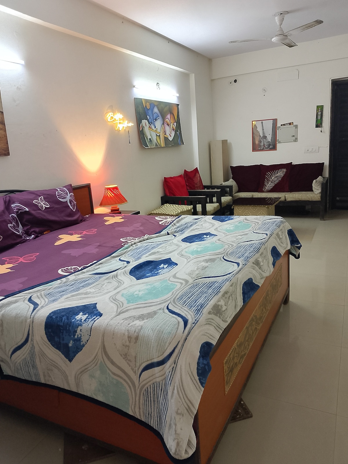 En «H is for Home» ofrecemos un espectacular apartamento privado de 3 dormitorios y 3 baños con una decoración elegante y servicios completos en el corazón de Delhi. Se encuentra en un edificio cerrado y seguro. Delicioso desayuno casero, té/café incluido. Ofrecemos servicio de coche + conductor para recogerte/dejarte en el aeropuerto, dentro de Delhi/NCR y para viajar a Agra/Jaipur. La unidad está situada en el tercer piso con acceso a través de un ascensor moderno. Todas las ventanas tienen rejillas y ofrecemos wifi Jio Fiber superrápido.