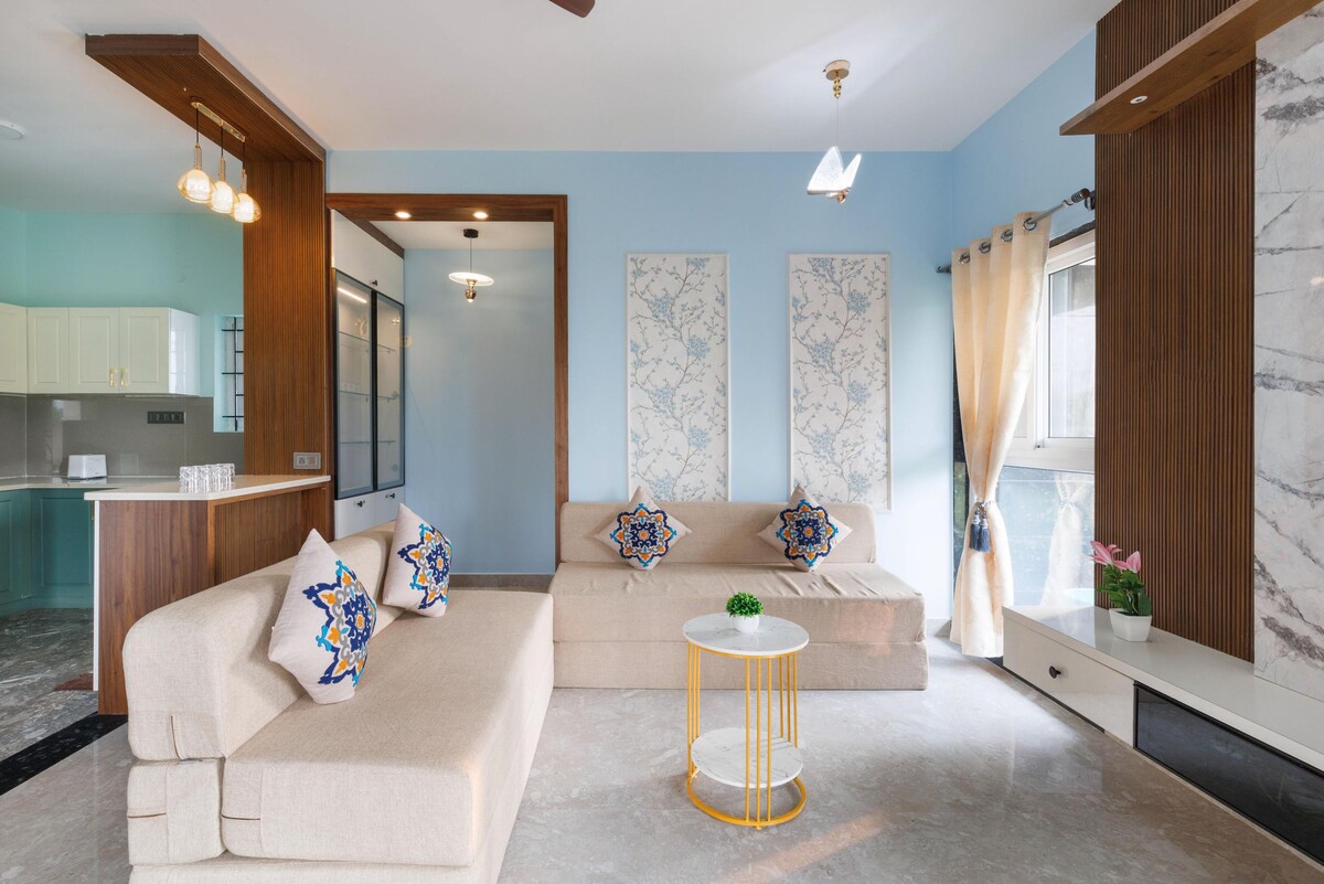 Este es un ático lujoso y espacioso situado en el centro de Bangalore y tiene 3 niveles con mucho espacio privado al aire libre. La vegetación y la luz natural que viene de la claraboya y las enormes ventanas de vidrio son lo más destacado. La casa está totalmente equipada con todas las comodidades modernas necesarias para una gran estadía. Servicio de limpieza diario, energía 24/7, ascensor, estacionamiento, cocina moderna, bar, espacio de escritorio para trabajar, Internet de alta velocidad, televisores de 65 pulgadas, barra de sonido JBL 5.1 son algunas de las comodidades estándar.