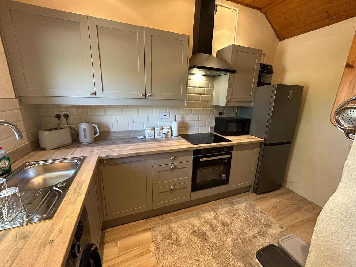 Relájate en un espacio acogedor rodeado de la belleza de la naturaleza. Observa el cambio de luz en las colinas desde el cómodo sofá, o toma un bastón y ve de excursión. Camina por el carril hasta el pintoresco lago (¡algunas almas resistentes podrían atreverse a darse un chapuzón rápido!). Recarga energías en una cama superking vestida con ropa de cama de calidad y revive en la ducha con efecto de lluvia tropical. La cocina pequeña tiene todo lo necesario para preparar comidas sencillas, y tu patio privado está completamente amueblado para comer al aire libre.