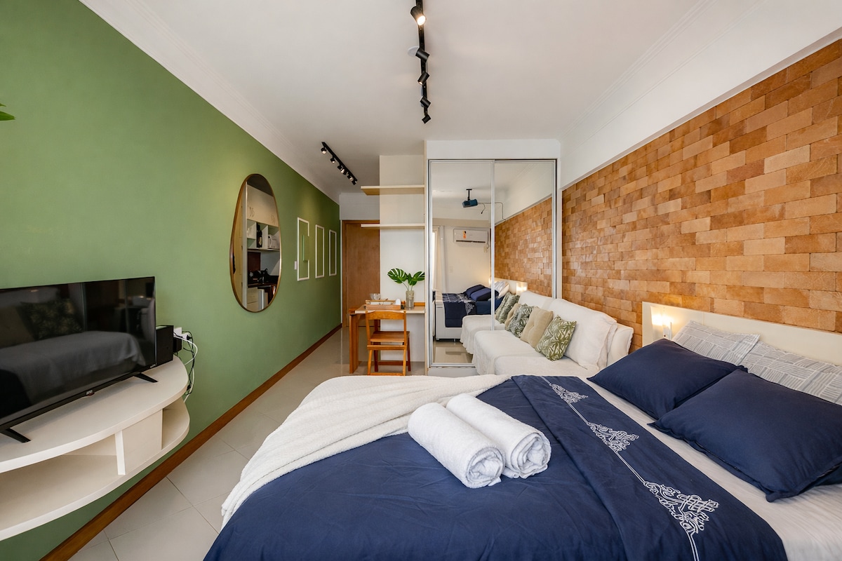 El apartamento tiene una habitación tipo estudio, con cama queen, en la sala un sofá cama y dejo un colchón suelto, es ideal para parejas con hijos, cocina con cocina de inducción con 2 hornillas, equipado con todos los utensilios Aire acondicionado frío y caliente en la habitación, pero calienta o enfría todo el apartamento, Proporciono ropa de cama y toallas, mantas, EL EDIFICIO TIENE UN BUEN ESTACIONAMIENTO INCLUIDO DENTRO DEL EDIFICIO El voltaje de la energía en SC es de 220 voltios