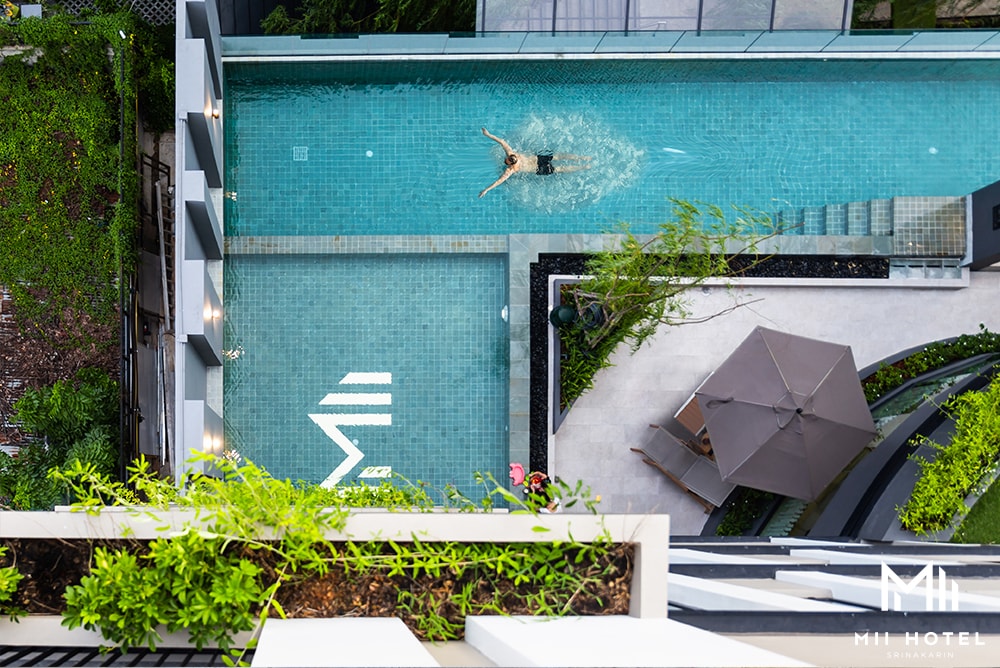 Una habitación con terraza en un hotel de lujo asequible ubicado en Bangkok. Mii Hotel es un "Hotel de diseño" de inspiración minimalista con instalaciones modernas y presta atención al detalle.