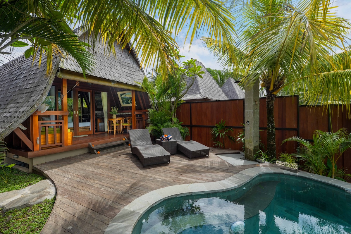 Esta villa tiene vistas al valle y al jardín tropical natural. Ha sido diseñado para una familia y tiene dos dormitorios con dos camas dobles o se puede ajustar a una cama doble y dos camas individuales. Y también tiene dos baños grandes. La piscina privada se divide en dos piscinas: una para adultos y otra para niños. Una terraza tradicional de madera ofrece una zona para tomar el sol. Esta es la villa de vacaciones perfecta para hospedarte mientras estás en Ubud.