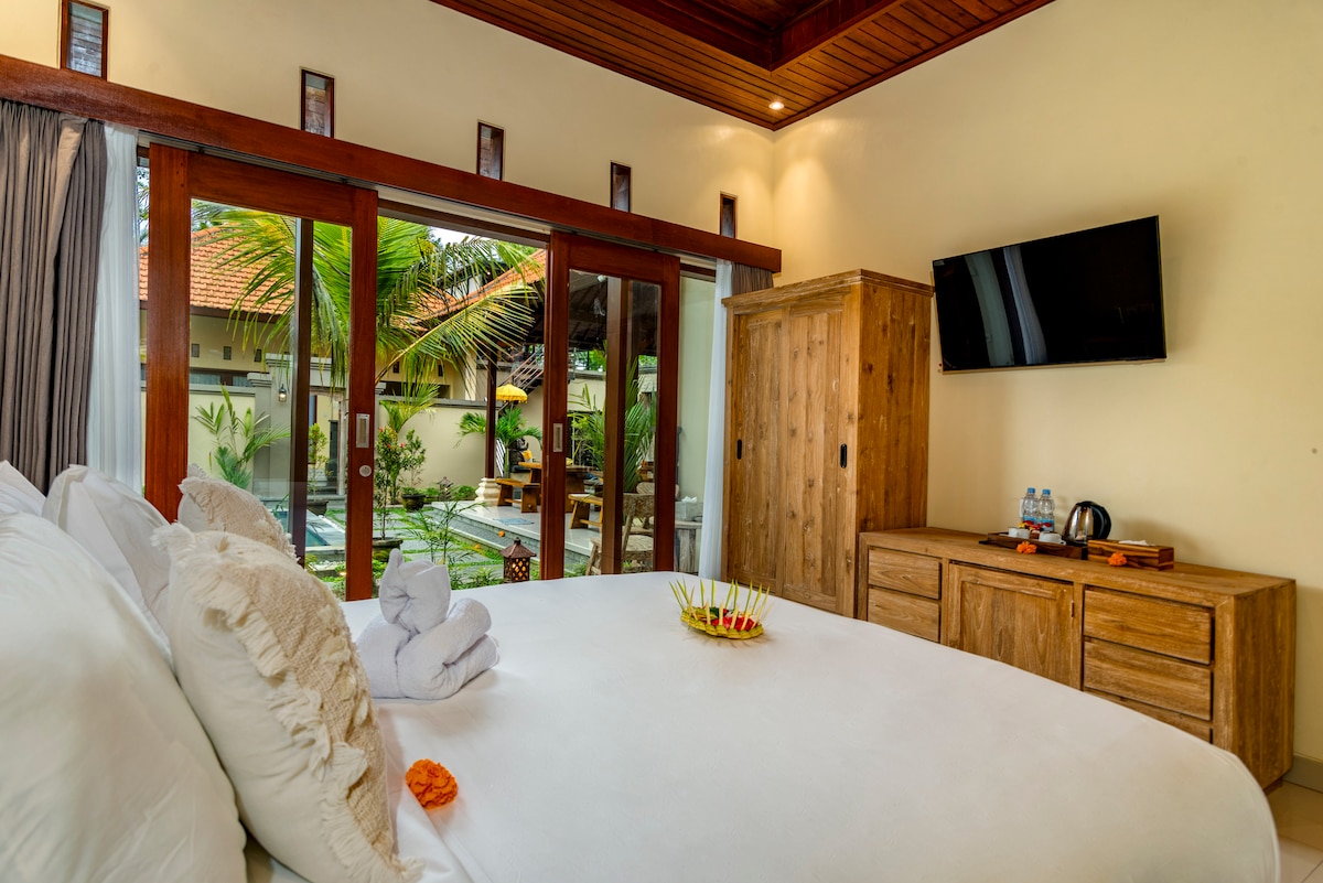 *Adults Only** Private heated (26-30°) pool villa. Relax in this calm, stylish space. Boutique accommodation, providing quiet luxury with one of the best views of Sidemen Valley. Private pool, nature outside your door, but closed living in your unit. Comfort to watch Sidemen life unfold. A place to sit, work or play. Nestled among the clove tree's high above the Sidemen Valley, offering a rest place for you while you undertake to experience traditional village life.