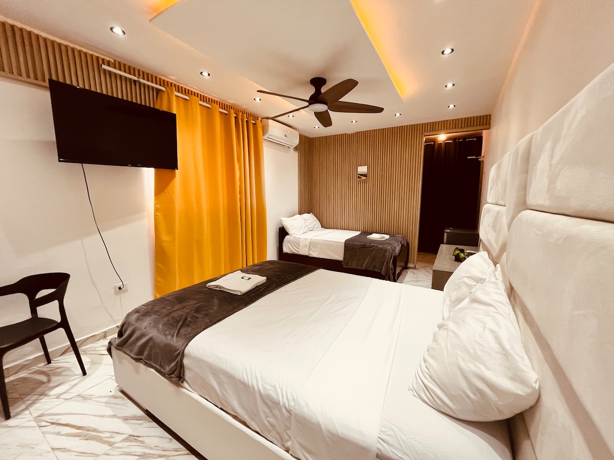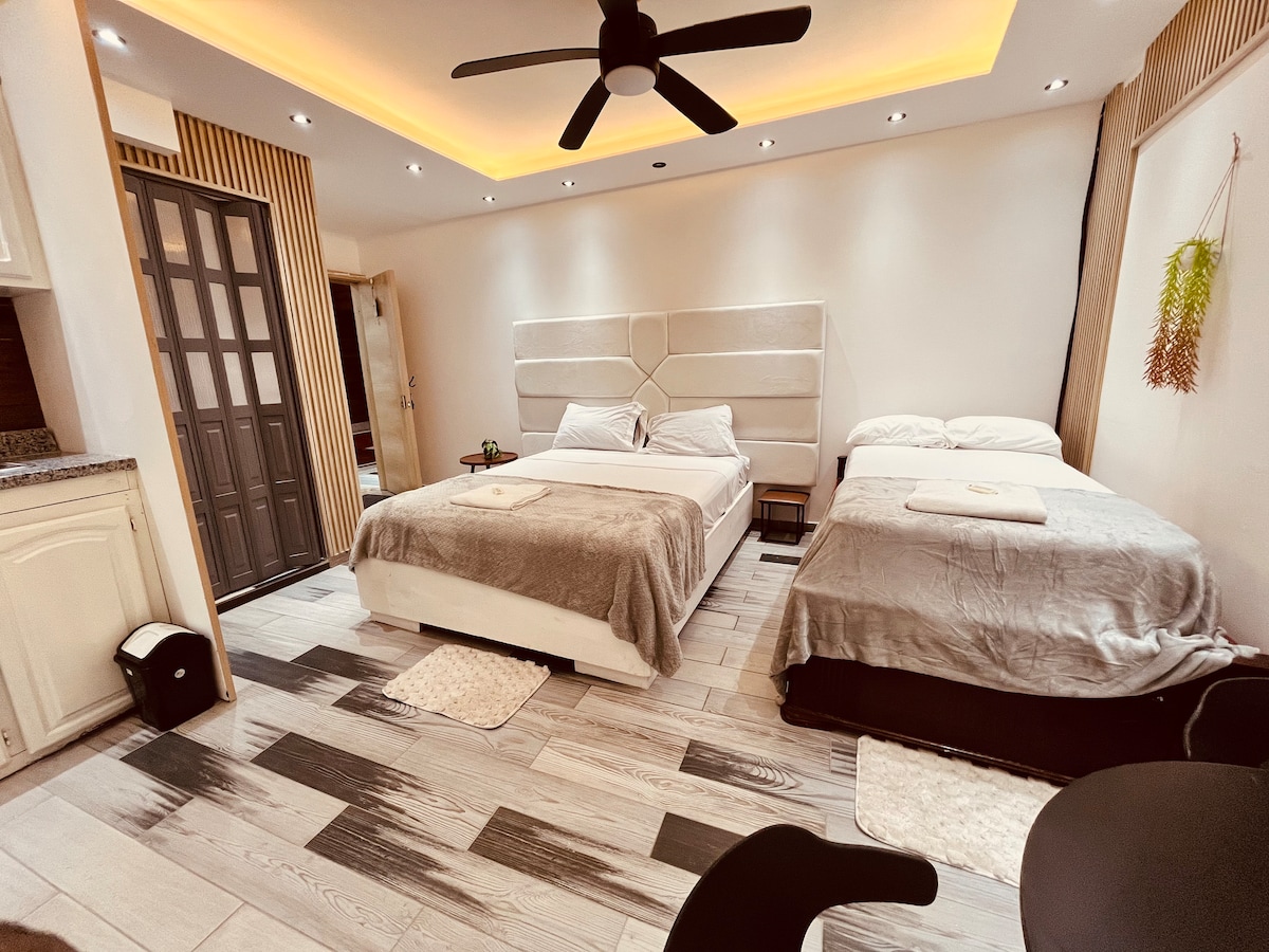 Una habitación con dos camas, sabanas,almohadas,toallas, acondicionadores de aire, baño privado,papel higiénico,jabon baño y jabon liquido de mano. Es una urbanización tranquila y con pocos ruidos para que asi tenga un feliz descanso.