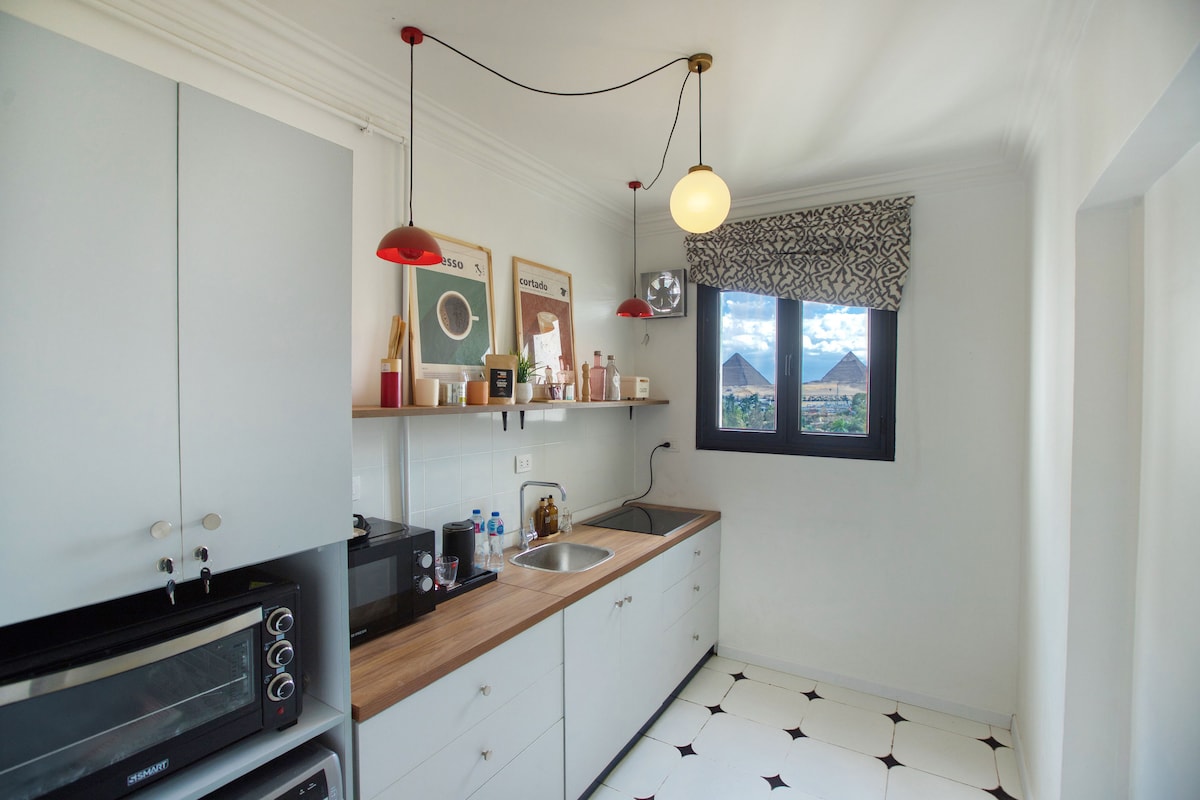 Welcome to our apartment! Just 5 minutes’ walk from the Sphinx and Pyramids entrance, with a stunning balcony view. Located in a safe and lively local area near restaurants, cafés, fruit shops, markets, and pharmacies. The apartment is fully air-conditioned, with fast unlimited Wi-Fi, a well-equipped kitchen, clean sheets, fresh towels, and a calm atmosphere. Probably the best place to enjoy the Pyramids view!
