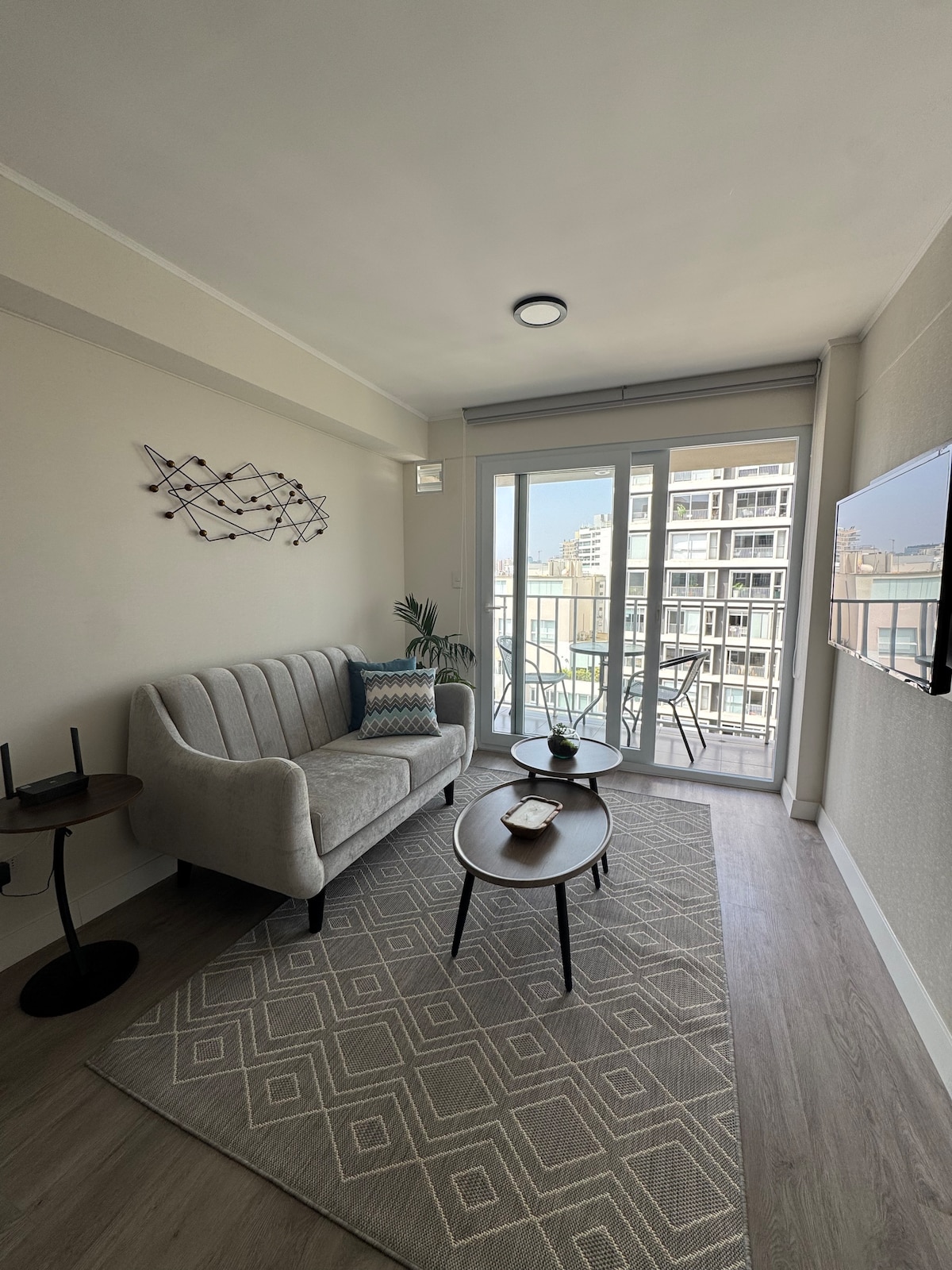 Departamento amplio y elegante en el corazón de Barranco. Ubicación privilegiada: A pasos de los principales puntos turísticos de Barranco y Miraflores, de los mejores restaurantes, bares y galerías de arte. Dormitorio principal: Cama king-size y gran walking closet. Espacio abierto y luminoso: Sala de estar y kitchenette con luz natural. Cochera privada: sujeta a disponibilidad Áreas comunes: Gimnasio, ambiente para reuniones y area de juego para niños. Estilo minimalista.