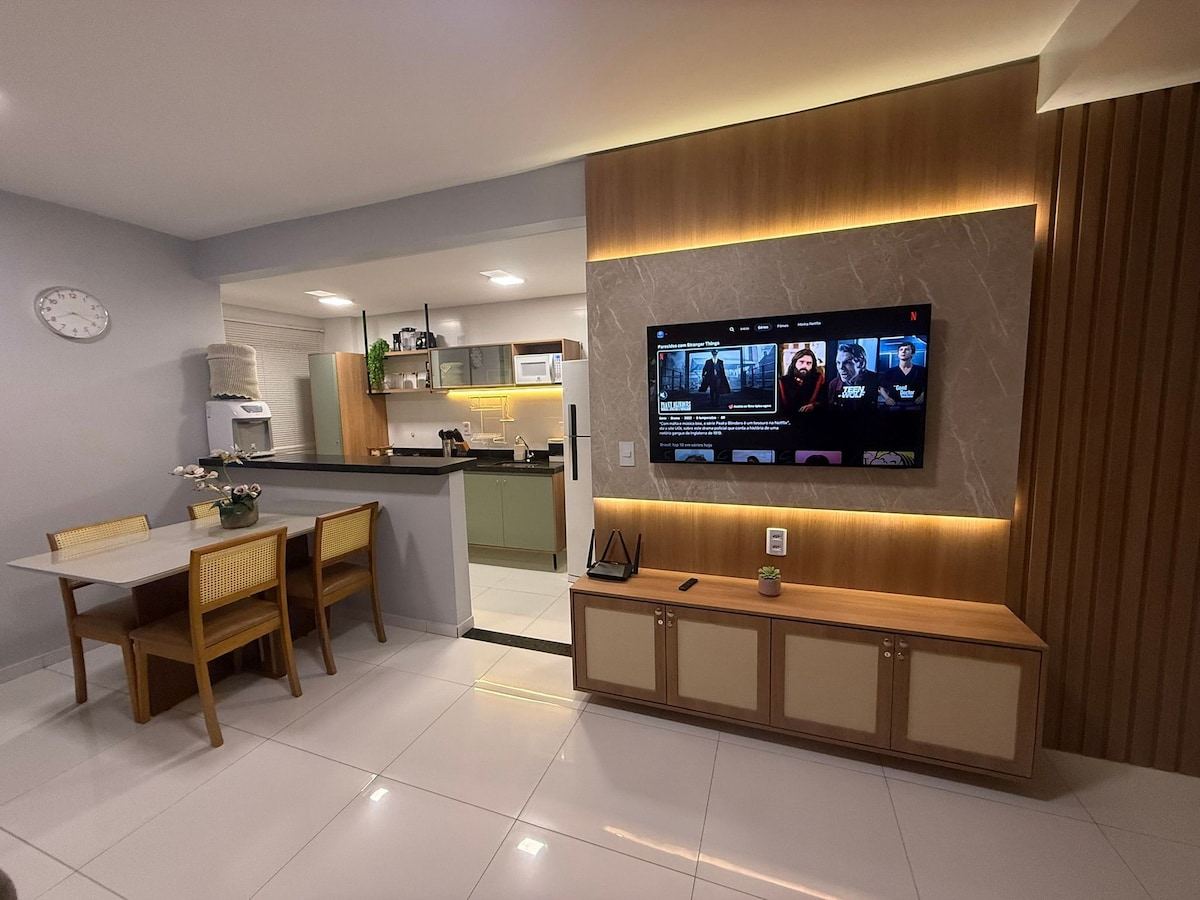 Dos habitaciones amplias, una de ellas una suite de dos habitaciones. Recomienda a quien más amas en este lugar ideal para familias. Ambiente familiar y tranquilo. Nuestro apartamento tiene 2 dormitorios, 2 baños, una sala de estar y una cocina completa, y un espacio de estacionamiento, voltaje de Maranhão 220W
