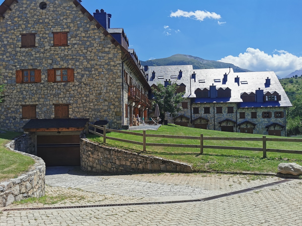 Apartamento situado en el precioso entorno del Pla de l'Ermita. Tiene un balcón con unas espléndidas vistas a las montañas y al jardín comunitario. La paz que se respira en este apartamento es máxima. Muy cercano a las pistas de esquí, al Parc Nacional d'Aigüestortes, a excursiones y paseos de montaña a todos los niveles i al excepcional Románico por la concentración de 8 Iglesias y una Ermita, conservadas a lo largo del tiempo y que están declarades por la Unesco Patrimonio Mundial.