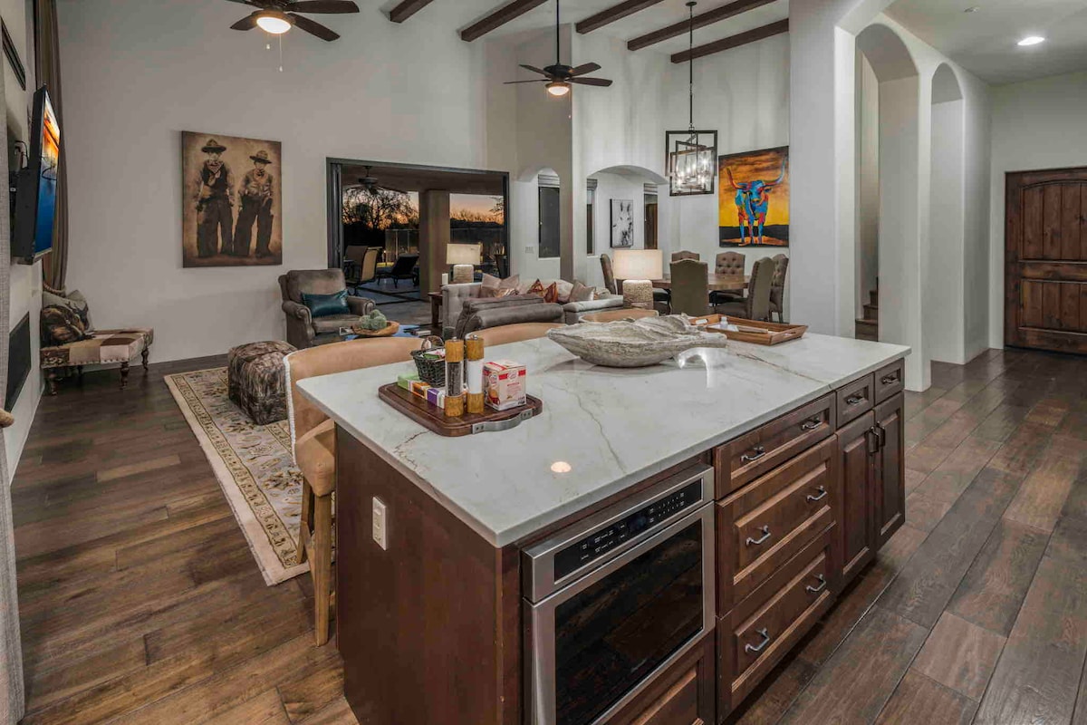 Welcome to The Hidden Hacienda Scottsdale! A fun, whimsical retreat with cowboy-chic decor, pool, spa, karaoke, and games—perfect for bachelorettes, families, or golf getaways. Sleeps 10 with comfy beds, smart TVs, a pool table and a fully stocked kitchen. Lounge beneath swaying palm trees, practice your swing on the mini putting green, or unwind in your private backyard oasis with cozy seating fire-pit and outdoor tv. Minutes to Kierland Commons, top golf courses, Spring Training and more!