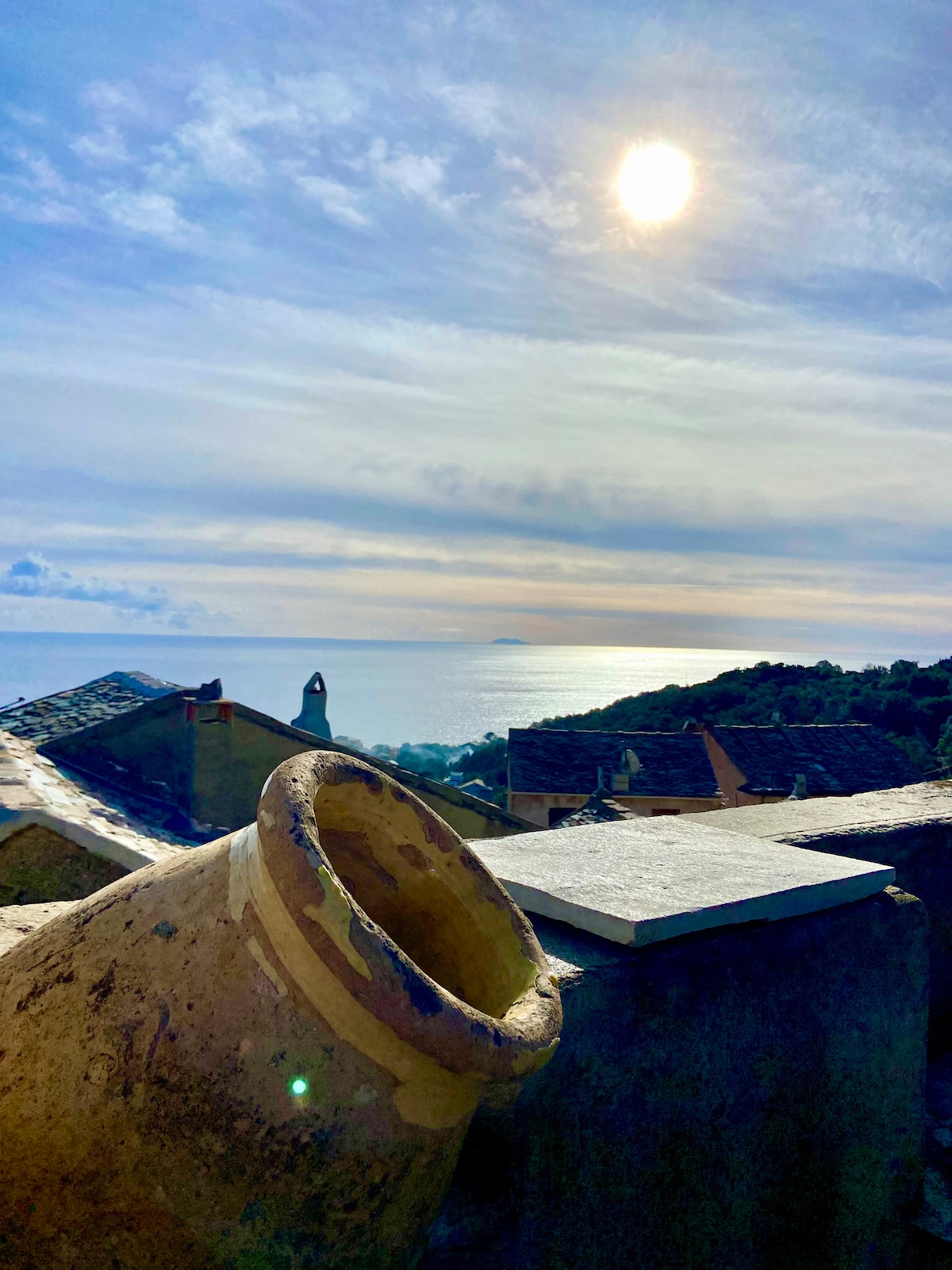 Tradition et confort, une grande pièce à vivre avec kitchette, une salle de bain rétro, chauffage Clim et rétro Clim + insert , jardin et douche extérieure sur vue mer et montagne dans un des plus beaux village du Cap Corse : Rogliano Le studio est située dans le très agréable et central hameau Bettolacce, à 10 mn de la mer en voiture, nombreux sentiers de marche