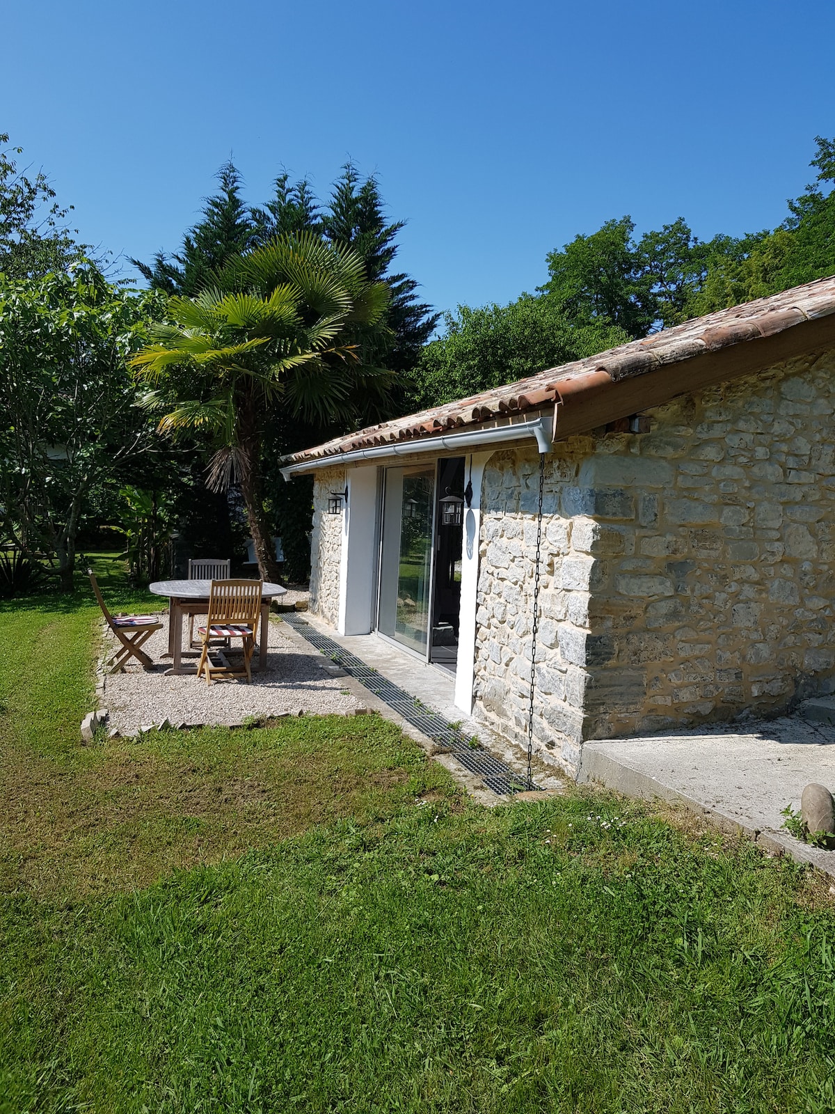 Esta antigua bodega de mampostería ha sido renovada para convertirla en un encantador alojamiento romántico en el que uno se siente bien. Se encuentra frente a un parque de 2 hectáreas arboladas, para una vista impresionante desde la terraza principal. El baño está equipado con una bañera y una ducha a ras de suelo. La amplia habitación con sus paredes de mampostería mantiene la frescura durante las calurosas noches de verano y tiene un encanto que no le dejará indiferente.