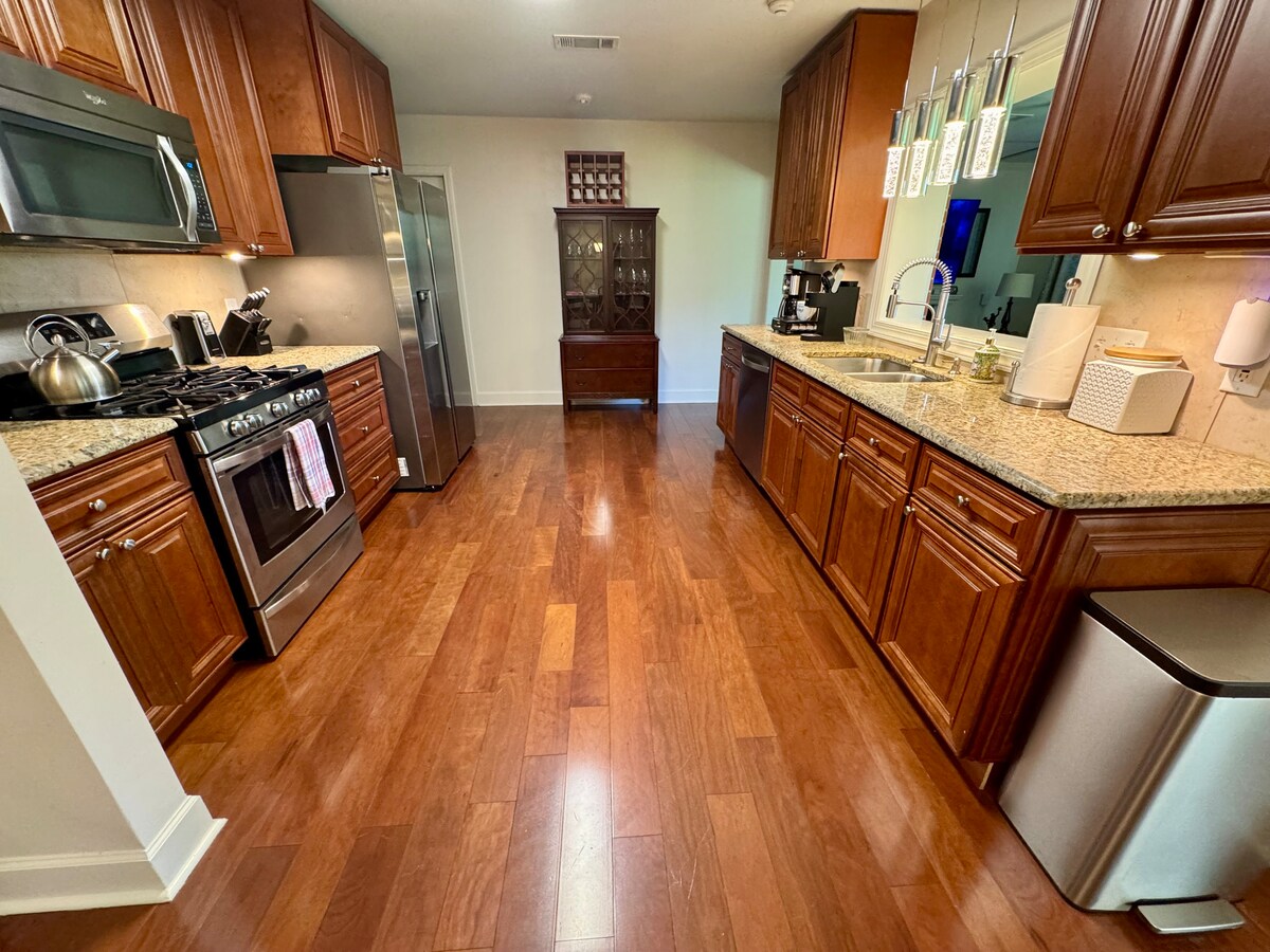 Nueva cama tamaño king en el dormitorio principal de arriba. La cama ajustable de gravedad cero está abajo en el segundo dormitorio. Hay un garaje para dos coches, lavadora, secadora, dormitorio y baño en la planta baja. La planta superior te lleva a la sala de estar principal, la cocina, el dormitorio con cama tamaño king y el baño. El patio trasero y el espacio vallado con césped con una chimenea al aire libre serán geniales para que te relajes y disfrutes del aire fresco y observes la vida silvestre en el roble. Hay aceras por todas partes y mucho sitio para aparcar en la calle delante de la casa.