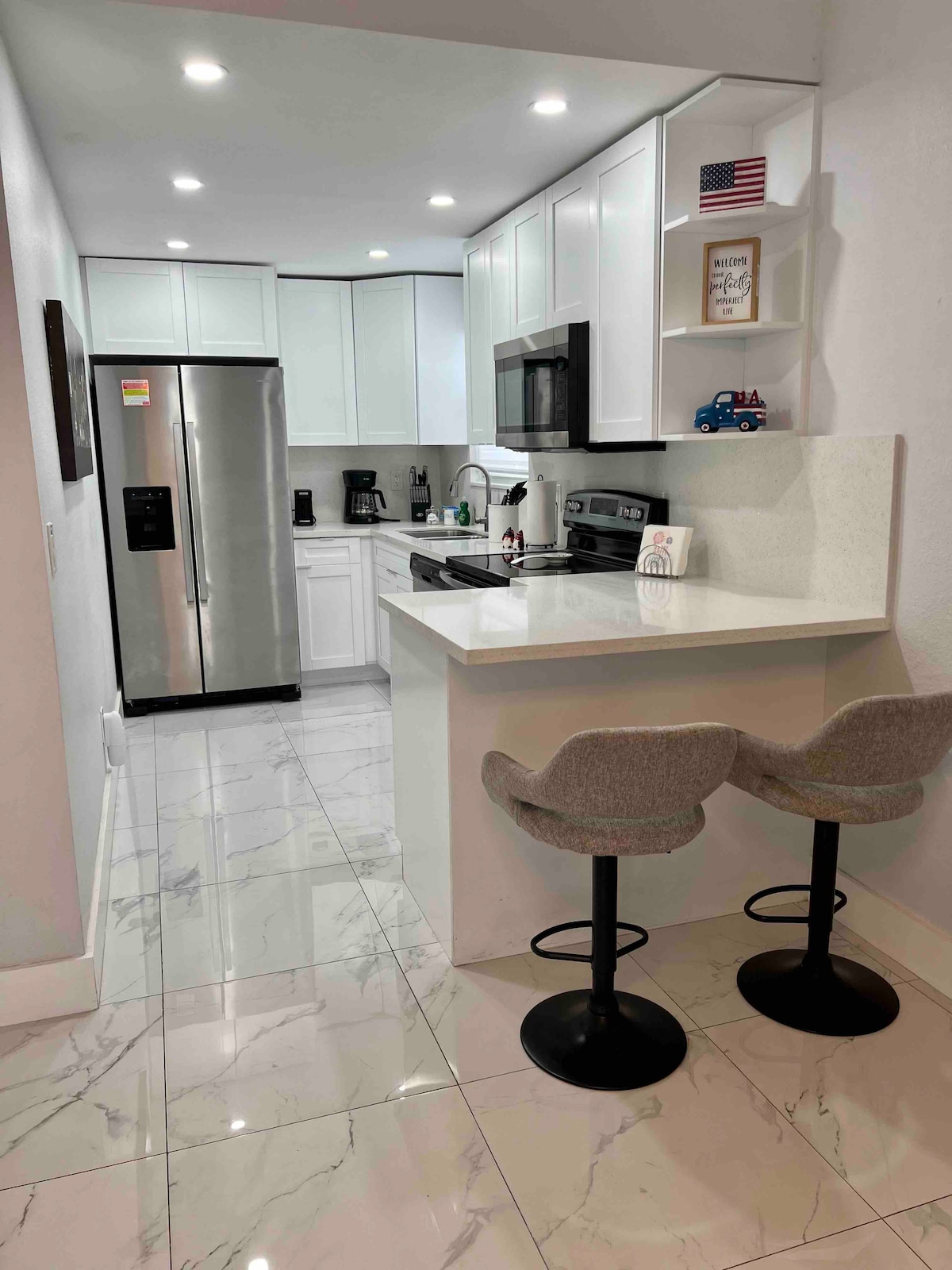 Seguimos las pautas de limpieza y vamos aún más lejos y utilizamos una máquina de esterilización de grado hospitalario para garantizar la seguridad de nuestros huéspedes. Este apartamento de dos dormitorios y un baño recientemente renovado y moderno con mucha luz natural, aire acondicionado central, electrodomésticos nuevos de acero inoxidable, microondas, horno, tostadora, cafetera, encimeras de granito, utensilios de cocina, camas cómodas y limpias, suelos de baldosas silenciosos, armarios grandes, 2 televisores de pantalla plana, wifi, 1 aparcamiento, lavandería con máquina de monedas, asientos en el balcón.