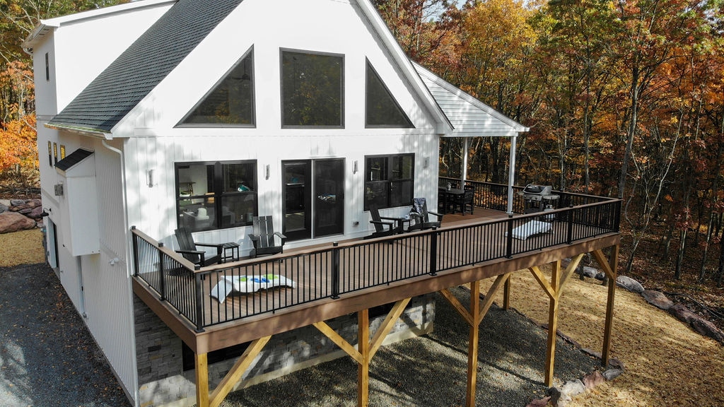 Rodéate de las vistas de la casa del árbol en un chalet moderno *Capacidad para 12 personas | Máximo 8 adultos por reservación *Los niños menores de 2 años deben incluirse en el total del huésped. *Baño para cada dormitorio *Ideal para multigeneraciones y grupos * Cargador de vehículos eléctricos, chimenea, jacuzzi y sala de juegos *Los trabajadores remotos y las reservaciones corporativas son bienvenidos *Espacio de trabajo exclusivo con terraza, impresora y WiFi. *A minutos del centro histórico de Jim Thorpe. * Acceso de temporada a la piscina comunitaria, el lago de 160 acres y el pickleball