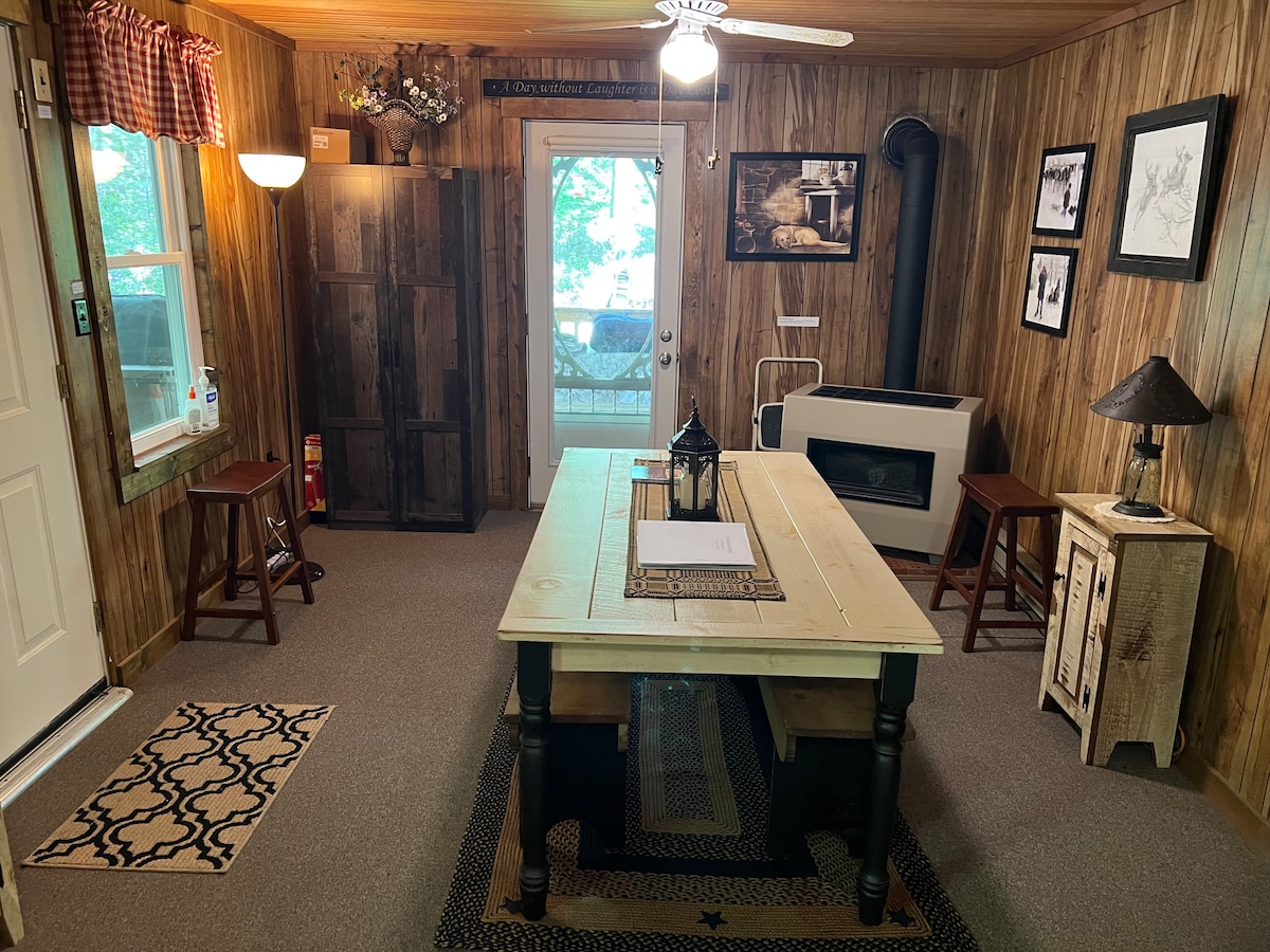 Ubicado en las pintorescas colinas del condado de Juniata, The Green Tree Grove ofrece un tranquilo refugio en la cabaña. Esta acogedora cabaña estudio cuenta con una cama de matrimonio y futón. La cocina pequeña cuenta con dispensador de agua, microondas, nevera y cafetera Keurig. Hay una parrilla de propano en el porche cubierto. No hay agua. Ducha exterior Outhouse trae toallas de agua, jabón, utensilios de cocina, platos, tazas, toallas de papel.